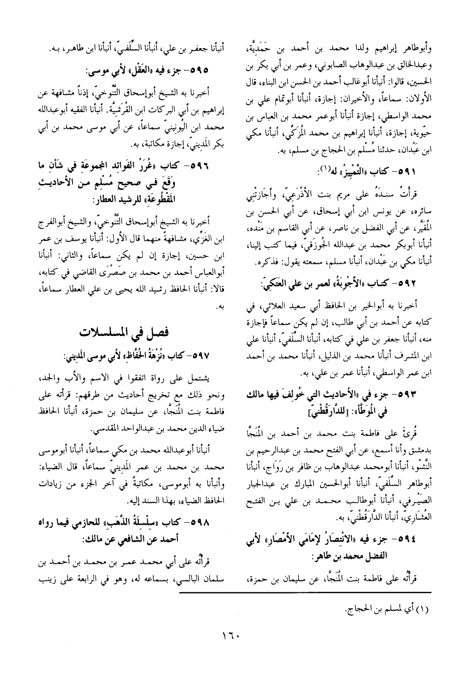 وَأَبُو طَاهِر إِبْرَاهِيم ولدا مُحَمَّد بن أَحْمد بن حمدية وَعبد الْخَالِق بن عبد الْوَهَّاب الصَّابُونِي وَعمر بن أبي بكر بن الْحُسَيْن قَالُوا أَنبأَنَا أَبُو غَالب أَحْمد بن الْحسن ابْن الْبناء قَالَ الْأَوَّلَانِ سَمَاعا والأخيران إجَازَة أَنبأَنَا أَبُو تَمام عَليّ بن مُحَمَّد الوَاسِطِيّ إجَازَة أَنبأَنَا أَبُو عمر مُحَمَّد بن الْعَبَّاس بن حيوية إجَازَة أَنبأَنَا إِبْرَاهِيم بن مُحَمَّد الْمُزَكي أَنبأَنَا مكي ابْن عَبْدَانِ حَدثنَا مُسلم بن الْحجَّاج بن مُسلم بِهِ