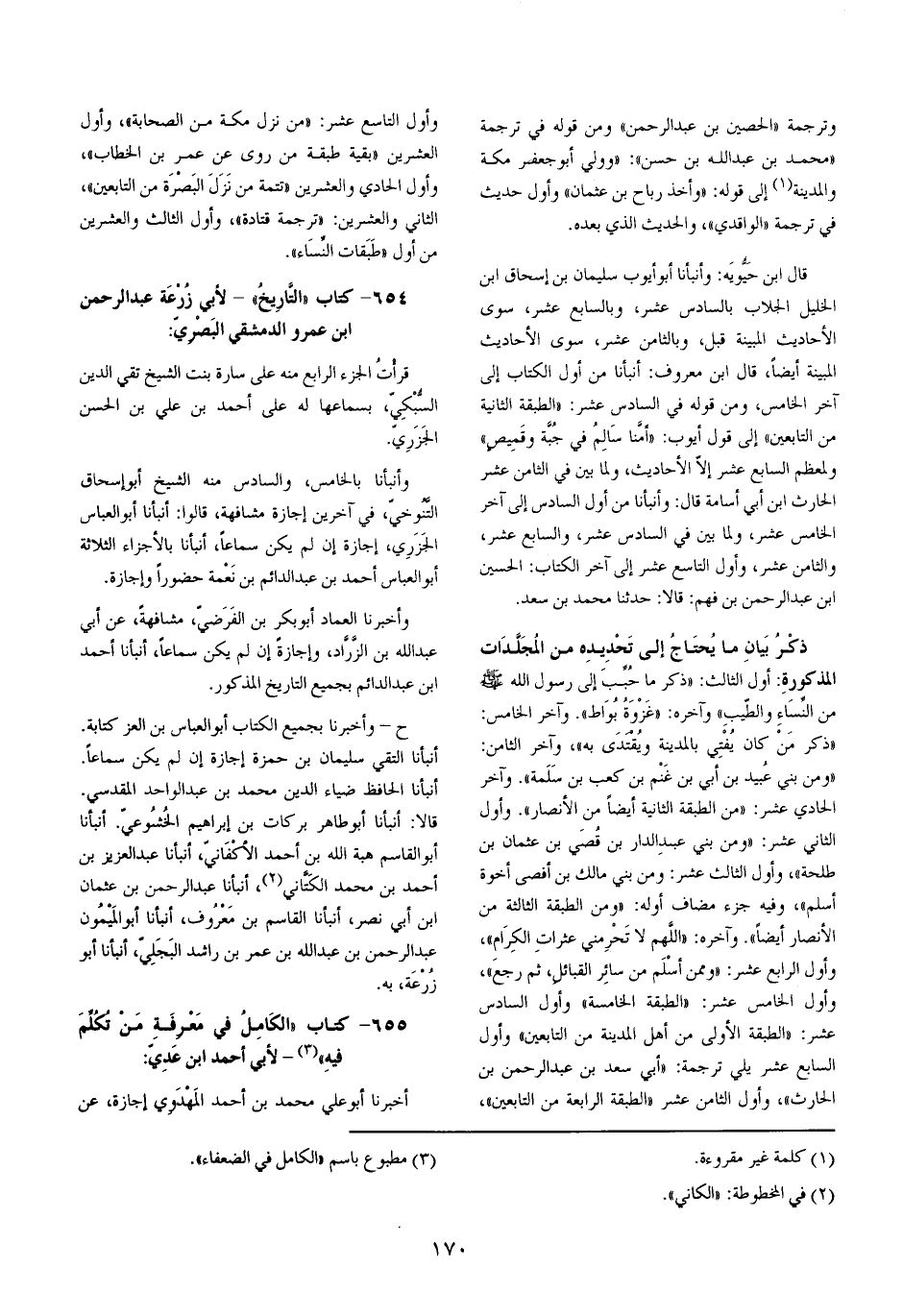 ذكر بَيَان مَا يحْتَاج إِلَى تحديده من المجلدات الْمَذْكُورَة أول الثَّالِث ذكر مَا حبب إِلَى رَسُول الله صلى الله عَلَيْهِ وَسلم من النِّسَاء وَالطّيب وَآخره غَزْوَة بواط وَآخر الْخَامِس ذكر من كَانَ يُفْتِي بِالْمَدِينَةِ ويقتدى بِهِ وَآخر الثَّامِن وَمن بني عبيد بن أبي بن غنم بن كَعْب بن سَلمَة وَآخر الْحَادِي عشر من الطَّبَقَة الثَّانِيَة أَيْضا من الْأَنْصَار وَأول الثَّانِي عشر وَمن بني عبد الدَّار بن قصي بن عُثْمَان بن طَلْحَة وَأول الثَّالِث عشر وَمن بني مَالك بن أفصى أخوة أسلم وَفِيه جُزْء مُضَاف أَوله وَمن الطَّبَقَة الثَّالِثَة من الْأَنْصَار أَيْضا وَآخره اللَّهُمَّ لَا تحرمني عثرات الْكِرَام وَأول الرَّابِع عشر وَمِمَّنْ أسلم من سَائِر الْقَبَائِل ثمَّ رَجَعَ وَأول الْخَامِس عشر الطَّبَقَة الْخَامِسَة وَأول السَّادِس عشر الطَّبَقَة الأولى من أهل الْمَدِينَة من التَّابِعين وَأول السَّابِع عشر يَلِي تَرْجَمَة أبي سعد بن عبد الرَّحْمَن بن الْحَارِث وَأول الثَّامِن عشر الطَّبَقَة الرَّابِعَة من التَّابِعين وَأول التَّاسِع عشر من نزل مَكَّة من الصَّحَابَة وَأول الْعشْرين بَقِيَّة طبقَة من روى عَن عمر بن الْخطاب وَأول الْحَادِي وَالْعِشْرين تَتِمَّة من نزل الْبَصْرَة من التَّابِعين الثَّانِي وَالْعِشْرين تَرْجَمَة قَتَادَة وَأول الثَّالِث وَالْعِشْرين من أول طَبَقَات النِّسَاء