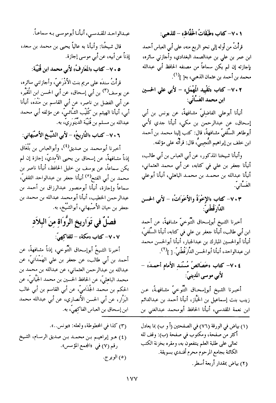 قَرَأت من أَوله إِلَى نَحْو الرّبع مِنْهُ على أبي الْعَبَّاس أَحْمد ابْن عمر بن عَليّ بن عبد الصَّمد الْبَغْدَادِيّ وأجازني سائره بإجازته إِن لم يكن سَمَاعا من مُصَنفه الْحَافِظ أبي عبد الله مُحَمَّد بن أَحْمد بن عُثْمَان الذَّهَبِيّ بِهِ