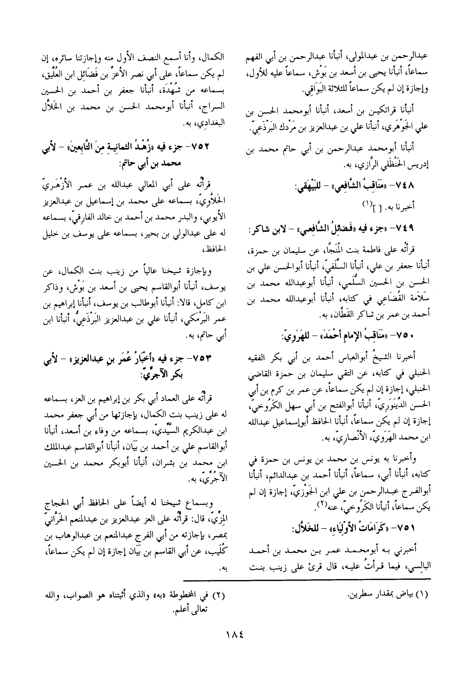 أَخْبرنِي بِهِ أَبُو مُحَمَّد عمر بن مُحَمَّد بن أَحْمد البالسي فِيمَا قَرَأت عَلَيْهِ قَالَ قرئَ على زَيْنَب بنت الْكَمَال وَأَنا أسمع النّصْف الأول مِنْهُ وأجازتنا سائره إِن لم يكن سَمَاعا على أبي نصر الْأَعَز بن فَضَائِل ابْن العليق بِسَمَاعِهِ من شهدة أَنبأَنَا جَعْفَر بن أَحْمد بن الْحُسَيْن السراج أَنبأَنَا أَبُو مُحَمَّد الْحسن بن مُحَمَّد بن الْخلال الْبَغْدَادِيّ بِهِ