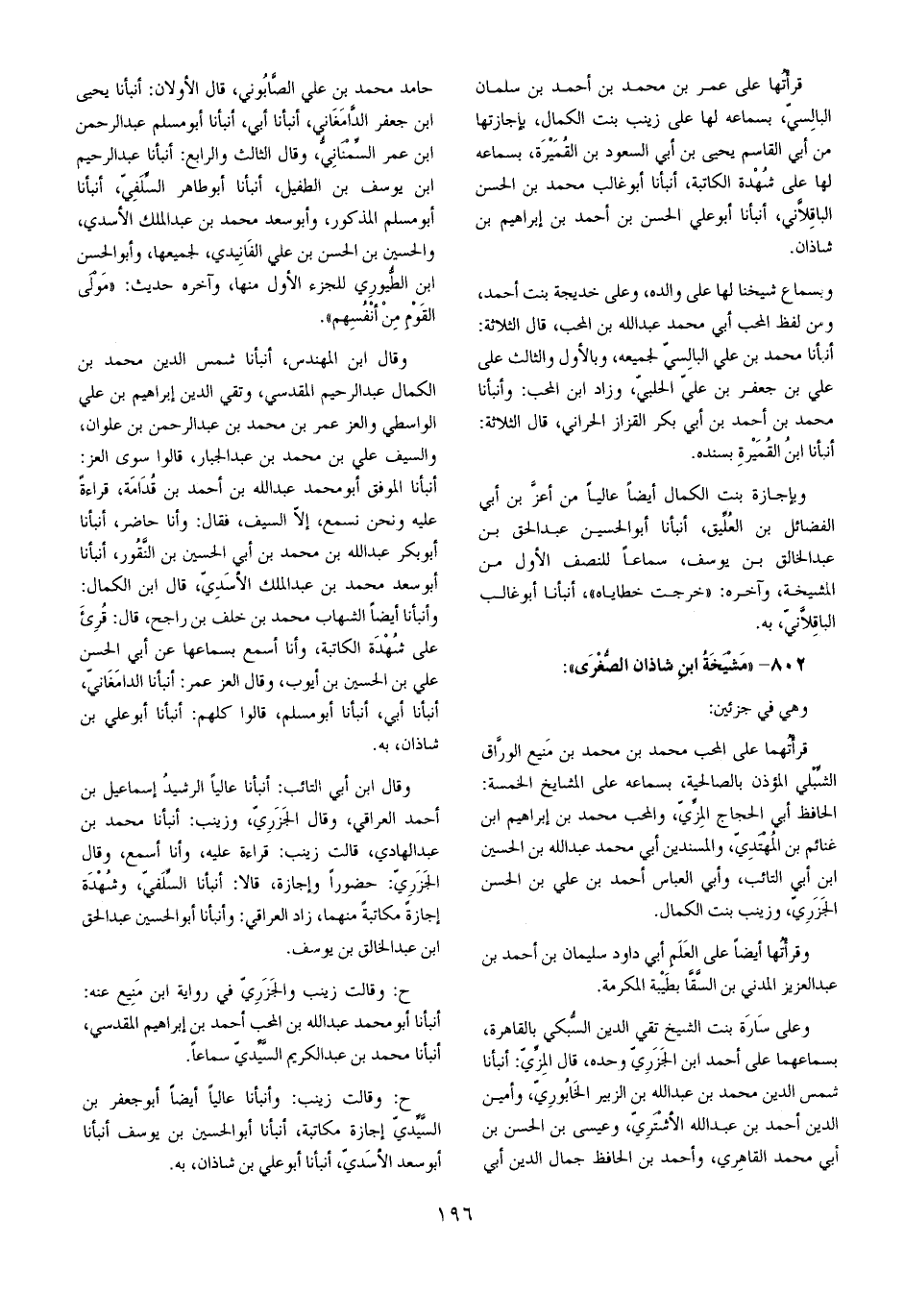 وَقَالَ ابْن المهندس أَنبأَنَا شمس الدّين مُحَمَّد بن الْكَمَال عبد الرَّحِيم الْمَقْدِسِي وتقي الدّين إِبْرَاهِيم بن عَليّ الوَاسِطِيّ والعز عمر بن مُحَمَّد بن عبد الرَّحْمَن بن علوان وَالسيف عَليّ بن مُحَمَّد بن عبد الْجَبَّار قَالُوا سوى الْعِزّ أَنبأَنَا الْمُوفق أَبُو مُحَمَّد عبد الله بن أَحْمد بن قدامَة قِرَاءَة عَلَيْهِ وَنحن نسْمع إِلَّا السَّيْف فَقَالَ وَأَنا حَاضر أَنبأَنَا أَبُو بكر عبد الله بن مُحَمَّد بن أبي الْحُسَيْن بن النقور أَنبأَنَا أَبُو سعد مُحَمَّد بن عبد الْملك الْأَسدي قَالَ ابْن الْكَمَال وأنبأنا أَيْضا الشهَاب مُحَمَّد بن خلف بن رَاجِح قَالَ قرئَ على شهدة الكاتبة وَأَنا أسمع بسماعها عَن أبي الْحسن عَليّ بن الْحُسَيْن بن أَيُّوب وَقَالَ الْعِزّ عمر أَنبأَنَا الدَّامغَانِي أَنبأَنَا أبي أَنبأَنَا أَبُو مُسلم قَالُوا كلهم أَنبأَنَا أَبُو عَليّ بن شَاذان بِهِ
