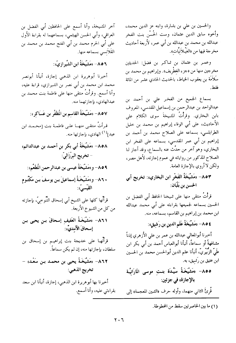 بِسَمَاع الْجَمِيع من الْفَخر عَليّ بن أَحْمد بن عبد الْوَاحِد بن عبد الرَّحْمَن بن إِسْمَاعِيل الْمَقْدِسِي الْمَعْرُوف بِابْن البُخَارِيّ وقرأت المشيخة سوى الْكَلَام على الْأَحَادِيث على أبي الْوَفَاء إِبْرَاهِيم بن مُحَمَّد بن خَلِيل الطرابلسي بِسَمَاعِهِ على الصّلاح مُحَمَّد بن أَحْمد بن إِبْرَاهِيم بن أبي عمر الْمَقْدِسِي بِسَمَاعِهِ على الْفَخر ابْن البُخَارِيّ وَهُوَ آخر من حدث عَنهُ بِالسَّمَاعِ وَقد أجَاز لنا الصّلاح الْمَذْكُور من رواياته فِي عُمُوم إِجَازَته لأهل مصر وَلَكِن لَا أروي بِالْإِجَازَةِ الْعَامَّة