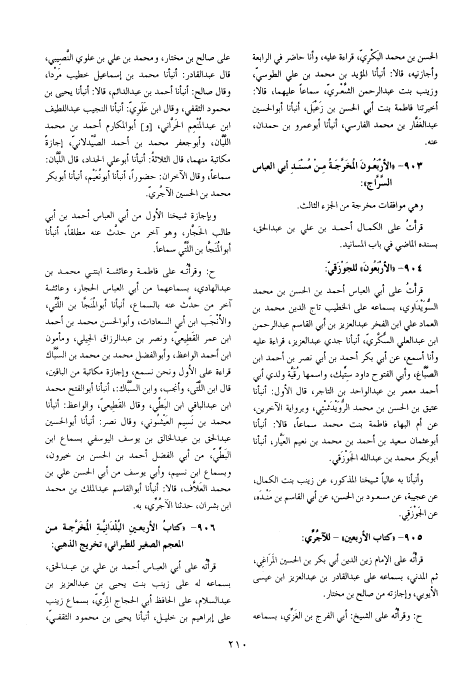 قَرَأت على أبي الْعَبَّاس أَحْمد بن الْحسن بن مُحَمَّد السويداوي بِسَمَاعِهِ على الْخَطِيب تَاج الدّين مُحَمَّد بن الْعِمَاد عَليّ ابْن الْفَخر عبد الْعَزِيز بن أبي الْقَاسِم عبد الرَّحْمَن ابْن عبد الْعلي السكرِي أَنبأَنَا جدي عبد الْعَزِيز قِرَاءَة عَلَيْهِ وَأَنا أسمع عَن أبي بكر أَحْمد بن أبي نصر بن أَحْمد ابْن الصّباغ وَأبي الْفتُوح دَاوُد ستيك وَاسْمهَا رقية وَلَدي أبي أَحْمد معمر بن عبد الْوَاحِد بن التَّاجِر قَالَ الأول أَنبأَنَا عَتيق بن الْحسن بن مُحَمَّد الرويدشتي وبرواية الآخرين عَن أم الْبَهَاء فَاطِمَة بنت مُحَمَّد سَمَاعا قَالَا أَنبأَنَا أَبُو عُثْمَان سعيد بن أَحْمد بن مُحَمَّد بن نعيم الْعيار أَنبأَنَا أَبُو بكر مُحَمَّد بن عبد الله الجوزقي