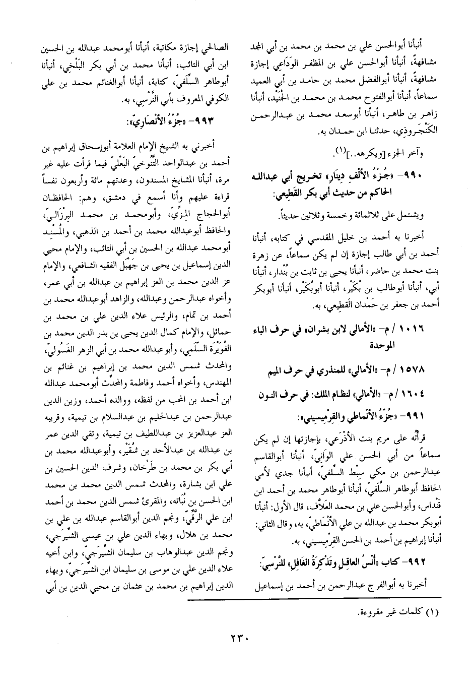 أَخْبرنِي بِهِ الشَّيْخ الإِمَام الْعَلامَة أَبُو إِسْحَاق إِبْرَاهِيم بن أَحْمد بن عبد الْوَاحِد التنوخي البعلي فِيمَا قَرَأت عَلَيْهِ غير مرّة أَنبأَنَا الْمَشَايِخ المسندون وعدتهم مائَة وَأَرْبَعُونَ نفسا قِرَاءَة عَلَيْهِم وَأَنا أسمع فِي دمشق وهم الحافظان أَبُو الْحجَّاج الْمزي وَأَبُو مُحَمَّد بن مُحَمَّد البرزالي والحافظ أَبُو عبد الله مُحَمَّد بن أَحْمد بن الذَّهَبِيّ والمسند أَبُو مُحَمَّد عبد الله بن الْحُسَيْن بن أبي التائب وَالْإِمَام محيي الدّين إِسْمَاعِيل بن يحيى بن جهبل الْفَقِيه الشَّافِعِي وَالْإِمَام عز الدّين مُحَمَّد بن الْعِزّ إِبْرَاهِيم بن عبد الله بن أبي عمر وأخواه عبد الرَّحْمَن وَعبد الله والزاهد أَبُو عبد الله مُحَمَّد بن أَحْمد بن تَمام والرئيس عَلَاء الدّين عَليّ بن مُحَمَّد بن حمائل وَالْإِمَام كَمَال الدّين يحيى بن بدر الدّين مُحَمَّد بن الفويرة السّلمِيّ وَأَبُو عبد الله مُحَمَّد بن ابي الزهر الغسولي والمحدث شمس الدّين مُحَمَّد بن إِبْرَاهِيم بن غَنَائِم بن المهندس وأخواه أَحْمد وَفَاطِمَة والمحدث أَبُو مُحَمَّد عبد الله ابْن أَحْمد بن الْمُحب من لَفظه ووالده أَحْمد وزين الدّين عبد الرَّحْمَن بن عبد الْحَلِيم بن عبد السَّلَام بن تَيْمِية وقريبه الْعِزّ عبد الْعَزِيز بن عبد اللَّطِيف بن تَيْمِية وتقي الدّين عمر بن عبد الله بن عبد الْأَحَد بن شقير وَأَبُو عبد الله مُحَمَّد بن أبي بكر بن مُحَمَّد بن طرخان وَشرف الدّين الْحُسَيْن بن عَليّ ابْن بِشَارَة والمحدث شمس الدّين مُحَمَّد بن مُحَمَّد ابْن الْحسن بن نَبَاته والمقرئ شمس الدّين مُحَمَّد بن أَحْمد ابْن عَليّ الرقي وَنجم الدّين أَبُو الْقَاسِم عبد الله بن عَليّ بن مُحَمَّد بن هِلَال وبهاء الدّين عَليّ بن عِيسَى الشيرجي وَنجم الدّين عبد الْوَهَّاب بن سُلَيْمَان الشيرجي وَابْن أَخِيه عَلَاء الدّين عَليّ بن مُوسَى بن سُلَيْمَان ابْن الشيرجي وبهاء الدّين إِبْرَاهِيم بن مُحَمَّد بن عُثْمَان بن محيي الدّين بن أبي