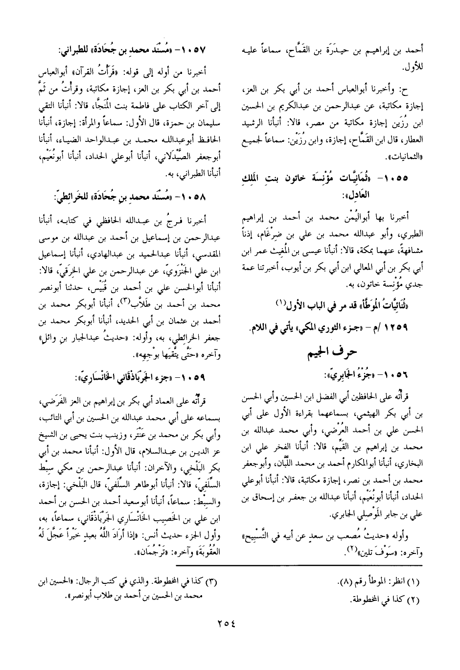 أخبرنَا من أَوله إِلَى قَوْله قَرَأت الْقُرْآن أَبُو الْعَبَّاس أَحْمد بن أبي بكر بن الْعِزّ إجَازَة مُكَاتبَة وقرأت من ثمَّ إِلَى آخر الْكتاب على فَاطِمَة بنت المنجا قَالَا أَنبأَنَا التقي سُلَيْمَان بن حَمْزَة قَالَ الأول سَمَاعا وَالْمَرْأَة إجَازَة أَنبأَنَا الْحَافِظ أَبُو عبد الله مُحَمَّد بن عبد الْوَاحِد الضياء أَنبأَنَا أَبُو جَعْفَر الصيدلاني أَنبأَنَا أَبُو عَليّ الْحداد أَنبأَنَا أَبُو نعيم أَنبأَنَا الطَّبَرَانِيّ بِهِ