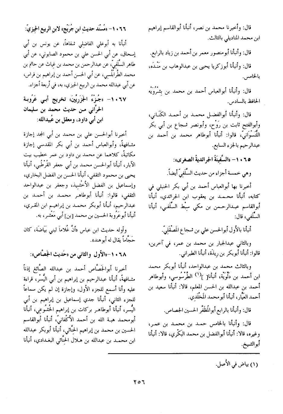 أخبرنَا أَبُو الْجَصَّاص أَحْمد بن عبد الله الصَّائِغ إِذْنا مشافهة أَنبأَنَا عبد الرَّحِيم بن إِبْرَاهِيم بن أبي الْيُسْر قِرَاءَة عَلَيْهِ وَأَنا أسمع للجزء الأول وإجازة إِن لم يكن سَمَاعا للجزء الثَّانِي أَنبأَنَا جدي إِسْمَاعِيل بن إِبْرَاهِيم بن أبي الْيُسْر أَنبأَنَا أَبُو طَاهِر بَرَكَات بن إِبْرَاهِيم الخشوعي أَنبأَنَا أَبُو مُحَمَّد هبة الله بن أَحْمد الْأَكْفَانِيِّ أَنبأَنَا أَبُو الْقَاسِم الْحُسَيْن بن مُحَمَّد بن إِبْرَاهِيم الحنائي أَنبأَنَا أَبُو بكر عبد الله ابْن مُحَمَّد بن عبد الله بن هِلَال الحنائي الْبَغْدَادِيّ أَنبأَنَا