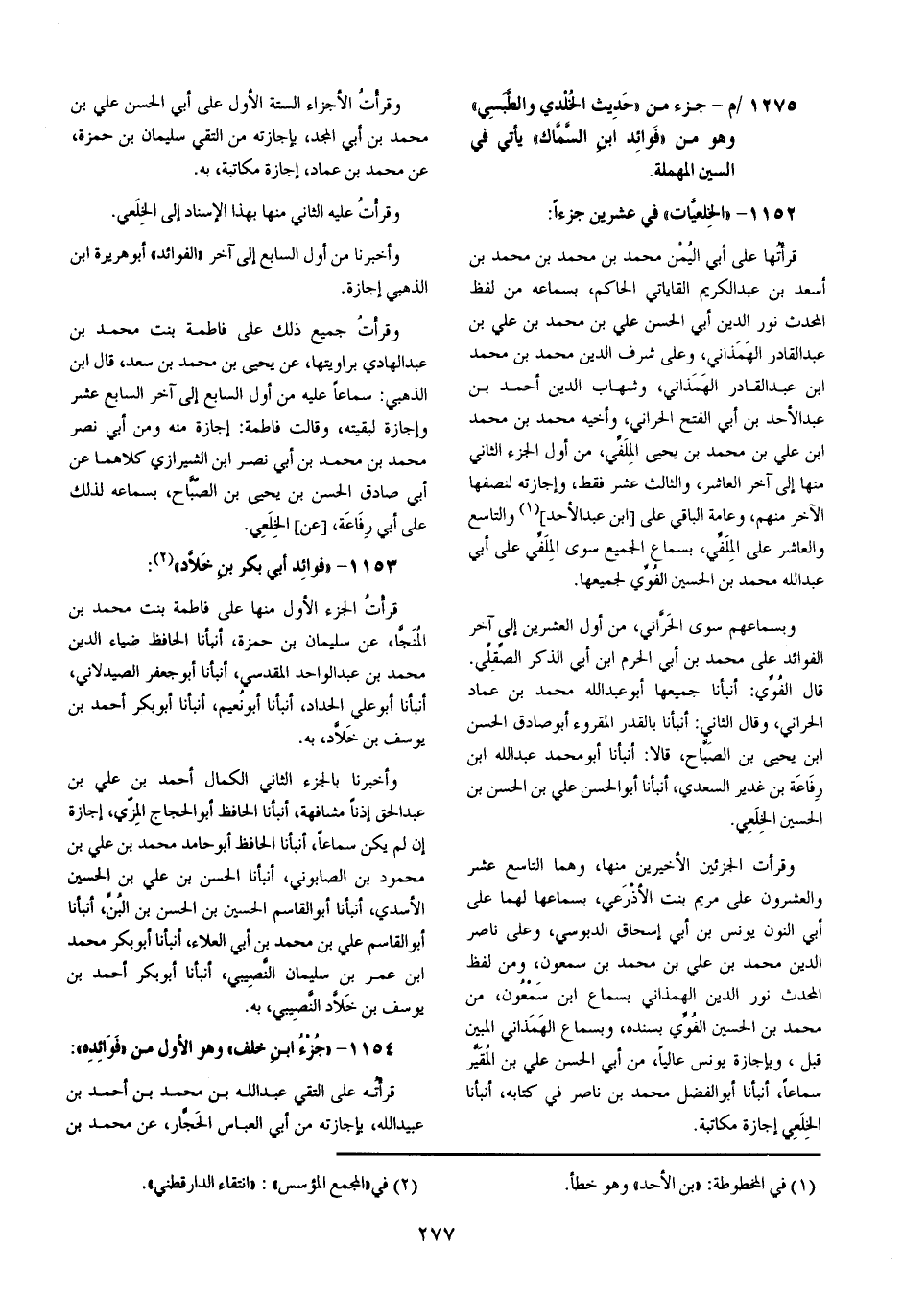 وَأخْبرنَا بالجزء الثَّانِي الْكَمَال أَحْمد بن عَليّ بن عبد الْحق إِذْنا مشافهة أَنبأَنَا الْحَافِظ أَبُو الْحجَّاج الْمزي إجَازَة إِن لم يكن سَمَاعا أَنبأَنَا الْحَافِظ أَبُو حَامِد مُحَمَّد بن عَليّ بن مَحْمُود بن الصَّابُونِي أَنبأَنَا الْحسن بن عَليّ بن الْحُسَيْن الْأَسدي أَنبأَنَا أَبُو الْقَاسِم الْحُسَيْن بن الْحسن بن البن أَنبأَنَا أَبُو الْقَاسِم عَليّ بن مُحَمَّد بن أبي الْعَلَاء أَنبأَنَا أَبُو بكر مُحَمَّد ابْن عمر بن سُلَيْمَان النصيبي أَنبأَنَا أَبُو بكر أَحْمد بن يُوسُف بن خَلاد النصيبي بِهِ