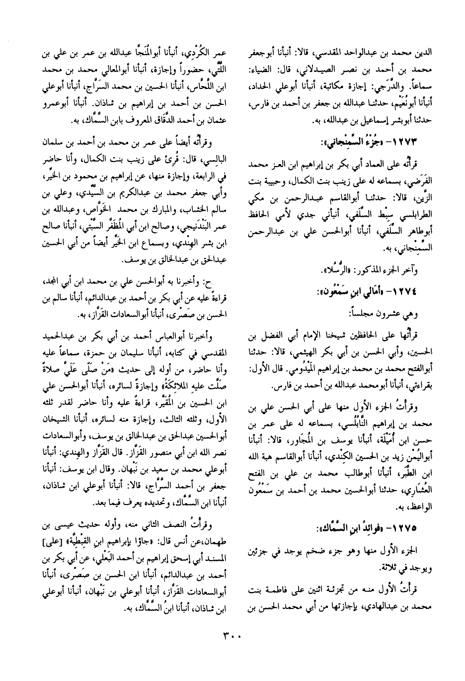 وَأخْبرنَا أَبُو الْعَبَّاس أَحْمد بن أبي بكر بن عبد الحميد الْمَقْدِسِي فِي كِتَابه أَنبأَنَا سُلَيْمَان بن حَمْزَة سَمَاعا عَلَيْهِ وَأَنا حَاضر من أَوله إِلَى حَدِيث من صلى عَليّ صَلَاة صلت عَلَيْهِ الْمَلَائِكَة وإجازة لسائره أَنبأَنَا أَبُو الْحسن عَليّ ابْن الْحُسَيْن بن المقير قِرَاءَة عَلَيْهِ وَأَنا حَاضر لقدر ثلثه الأول وَثلثه الثَّالِث وإجازة مِنْهُ لسائره أَنبأَنَا الشَّيْخَانِ أَبُو الْحُسَيْن عبد الْحق بن عبد الْخَالِق بن يُوسُف وَأَبُو السعادات نصر الله ابْن أبي مَنْصُور الْقَزاز قَالَ الْقَزاز والهندي أَنبأَنَا أَبُو عَليّ مُحَمَّد بن سعيد بن نَبهَان وَقَالَ ابْن يُوسُف أَنبأَنَا جَعْفَر بن أَحْمد السراج قَالَا أَنبأَنَا أَبُو عَليّ ابْن شَاذان أَنبأَنَا ابْن السماك وتحديده يعرف فِيمَا بعد
