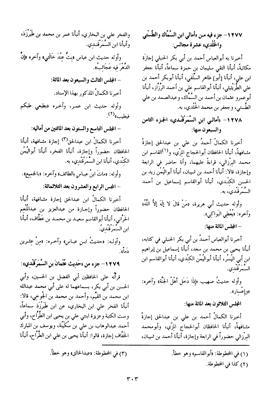 أخبرنَا الْكَمَال أَحْمد بن عَليّ بن عبد الْحق إجَازَة مشافهة أَنبأَنَا الحافظان أَبُو الْحجَّاج الْمزي وَأَبُو مُحَمَّد البرزالي حضورا فِي الرَّابِعَة وإجازة أَنبأَنَا أَحْمد بن شَيبَان وَالْفَخْر عَليّ بن البُخَارِيّ أَنبأَنَا عمر بن مُحَمَّد بن طبرزذ وأنبأنا ابْن السَّمرقَنْدِي