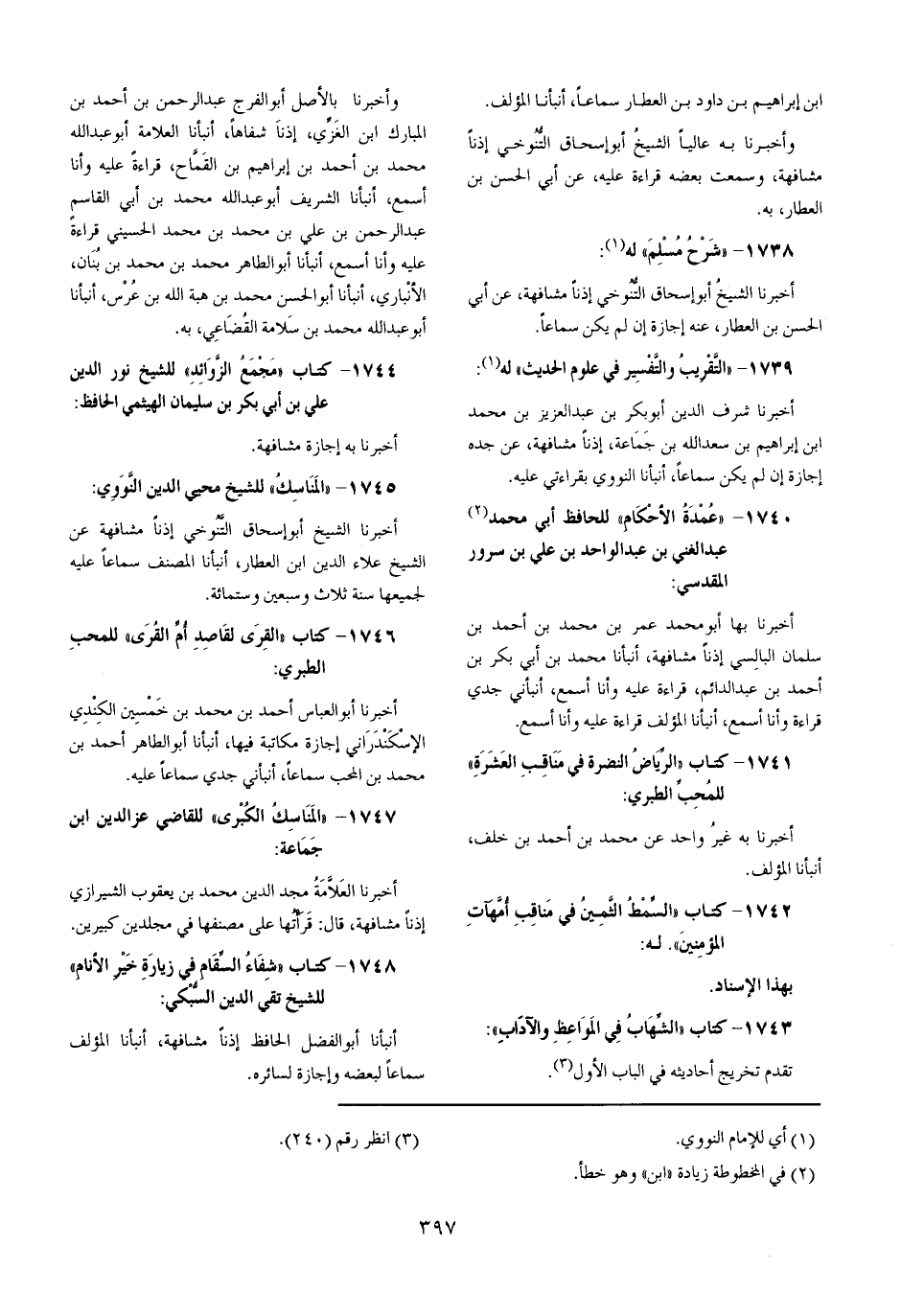أخبرنَا الشَّيْخ أَبُو إِسْحَاق التنوخي إِذْنا مشافهة عَن الشَّيْخ عَلَاء الدّين ابْن الْعَطَّار أَنبأَنَا المُصَنّف سَمَاعا عَلَيْهِ لجميعها سنة ثَلَاث وَسبعين وسِتمِائَة