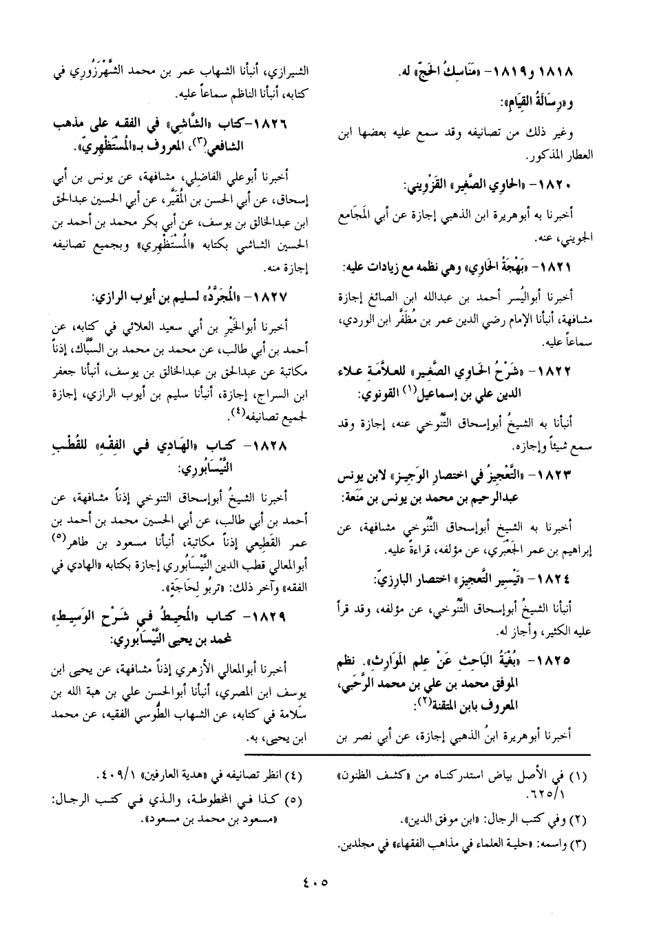 أخبرنَا الشَّيْخ أَبُو إِسْحَاق التنوخي إِذْنا مشافهة عَن أَحْمد بن أبي طَالب عَن أبي الْحُسَيْن مُحَمَّد بن أَحْمد بن عمر الْقطيعِي إِذْنا مُكَاتبَة أَنبأَنَا مَسْعُود بن طَاهِر أَبُو الْمَعَالِي قطب الدّين النَّيْسَابُورِي إجَازَة بكتابه الْهَادِي فِي الْفِقْه وَآخر ذَلِك تربو لحَاجَة