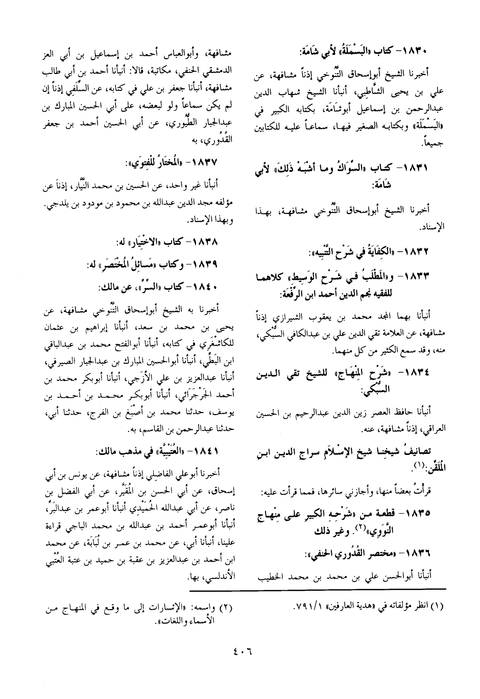 أخبرنَا الشَّيْخ أَبُو إِسْحَاق التنوخي إِذْنا مشافهة عَن عَليّ بن يحيى الشاطبي أَنبأَنَا الشَّيْخ شهَاب الدّين عبد الرَّحْمَن بن إِسْمَاعِيل أَبُو شامة بكتابه الْكَبِير فِي الْبَسْمَلَة وبكتابه الصَّغِير فِيهَا سَمَاعا عَلَيْهِ للكتابين جَمِيعًا