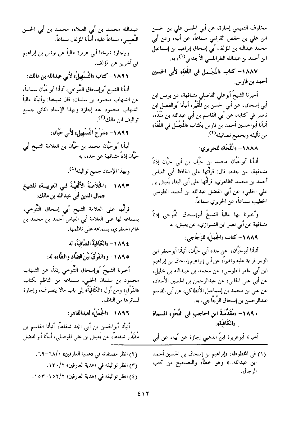 أَنبأَنَا أَبُو حَيَّان عَن جده أبي حَيَّان أَنبأَنَا أَبُو جَعْفَر ابْن الزبير قِرَاءَة عَلَيْهِ ونظرا عَن أبي إِبْرَاهِيم إِسْحَاق بن إِبْرَاهِيم ابْن أبي عَامر الطوسي عَن مُحَمَّد بن عبد الله بن خَلِيل عَن أبي عَليّ الحاني عَن عبد الرَّحْمَن بن الْحُسَيْن الْأُسْتَاذ عَن عَليّ بن مُحَمَّد بن إِسْمَاعِيل الْأَنْطَاكِي عَن أبي الْقَاسِم عبد الرَّحْمَن بن إِسْحَاق الزجاجي بِهِ