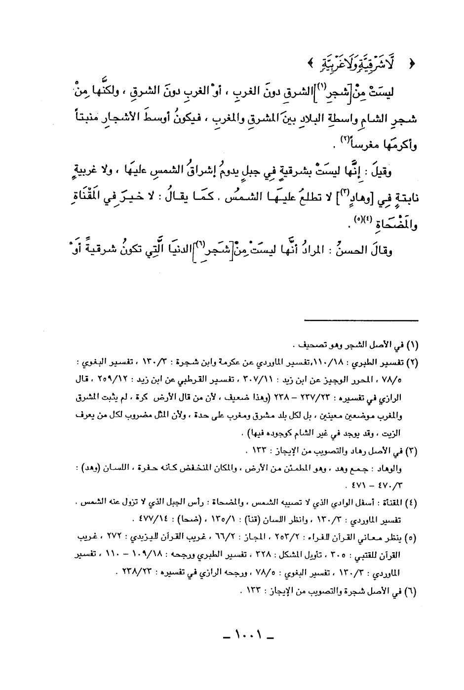 ليست من [شجر] الشرق دون الغرب، أو الغرب دون الشرق، ولكنها من شجر الشام واسطة البلاد بين المشرق والمغرب، فيكون أوسط الأشجار منبتاً وأكرمها مغرساً.