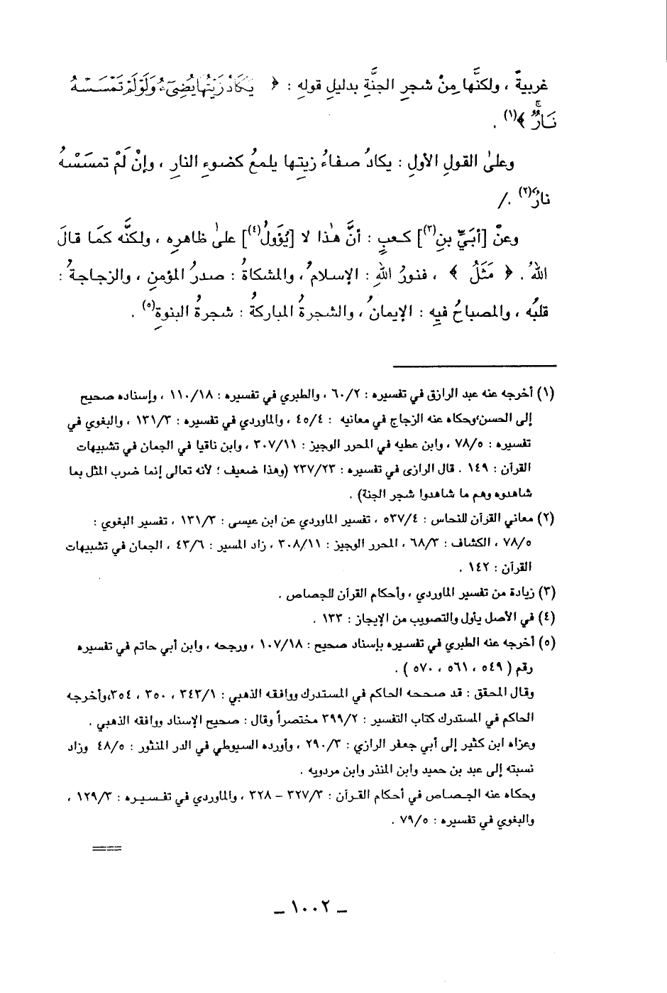 وعن [أبي بن] كعب: أن هذا لا [يؤول] على ظاهره، ولكنه كما قال الله، (مثل)، فنور الله: الإسلام، والمشكاة: صدر المؤمن، والزجاجة: قلبه، والمصباح فيه: الإيمان، والشجرة المباركة: شجرة البنوة.