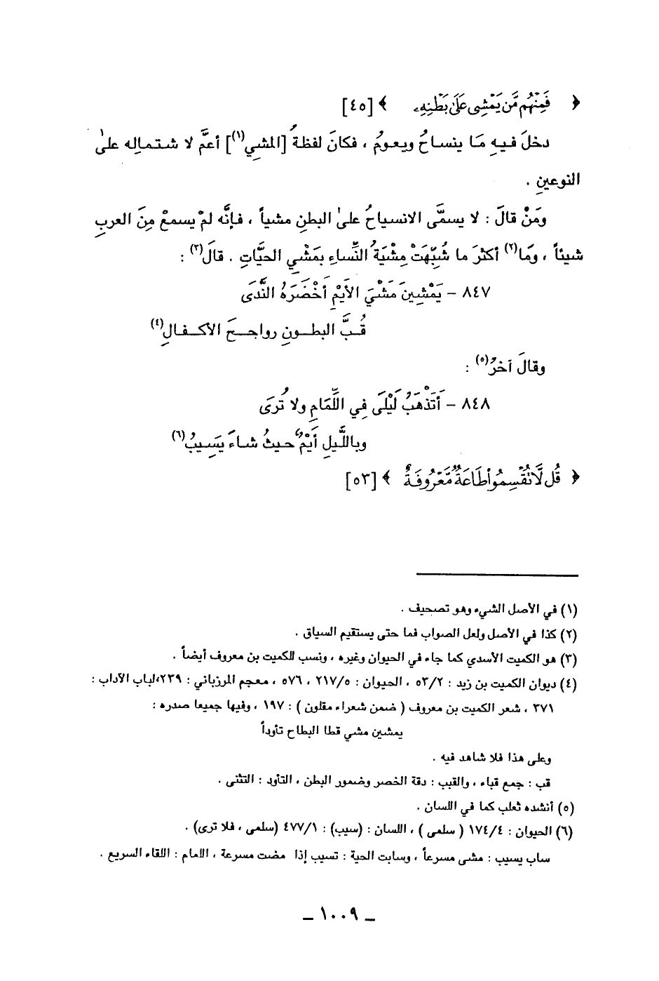 ومن قال: لا يسمى الانسياح على البطن مشياً، فإنه لم يسمع من العرب شيئاً، وما أكثر ما شبهت مشية النساء بمشي الحيات. قال: