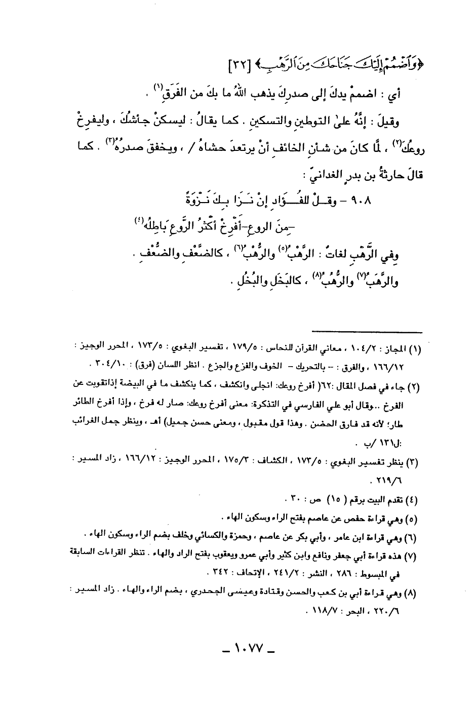 وقيل: إنه على التوطين والتسكين. كما يقال: ليسكن جأشك، وليفرخ روعك، لما كان من شأن الخائف أن يرتعد حشاه/، ويخفق صدره. كما قال حارثة بن بدر الغداني: