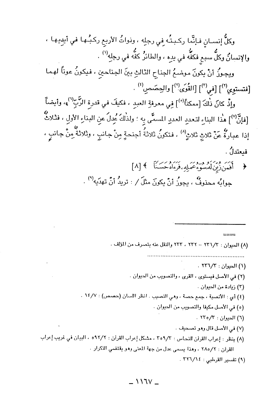 وإذ كان ذلك [ممكناً] في معرفة العبد، فكيف في قدرة الرب"، وأيضاً [فإن] هذا البناء لتعدد العدد المسمى به، ولذلك عدل عن البناء الأول، فثلاث إذا عبارة عن ثلاث ثلاث، فتكون ثلاثة أجنحة من جانب، وثلاثة من جانب، فيعتدل.
