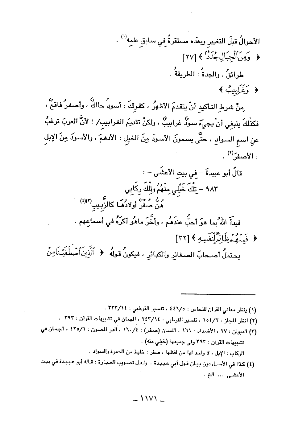 من شرط التأكيد أن يتقدم الأظهر، كقولك: أسود حالك، وأصفر فاقع، فكذلك ينبغي أن يجيء سود غرابيب، ولكن تقديم الغرابيب، لأن العرب ترغب عن اسم السواد، حتى يسمون الأسود من الخيل: الأدهم، والأسود من الإبل: الأصفر.