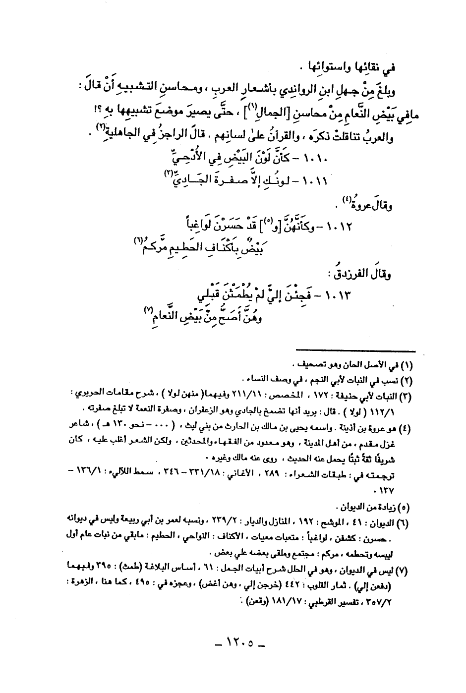 وبلغ من جهل ابن الرواندي بأشعار العرب، ومحاسن التشبيه أن قال: ما في بيض النعام من محاسن [الجمال]، حتى يصير موضع تشبيهها به؟! والعرب تناقلت ذكره، والقرآن على لسانهم، قال الراجز في الجاهلية:
