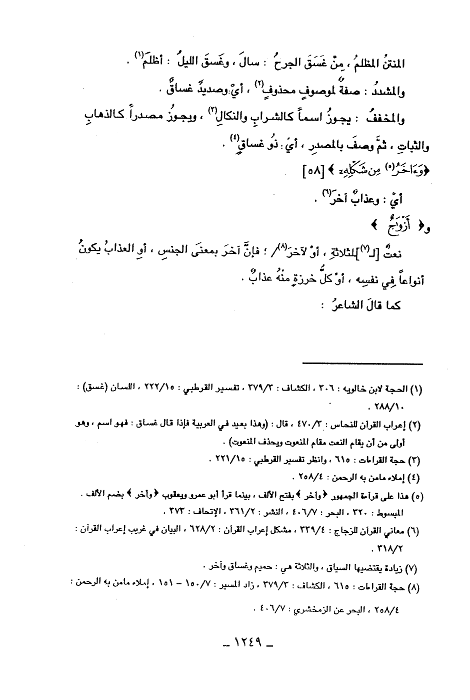 المنتن المظلم، من غسق الجرح: سال، وغسق الليل: أظلم. والمشدد: صفة لموصوف محذوف، أي: وصديد غساق. والمخفف: يجوز اسماً كالشراب والنكال، ويجوز مصدراً كالذهاب والثبات، ثم وصف بالمصدر، أي: ذو غساق.