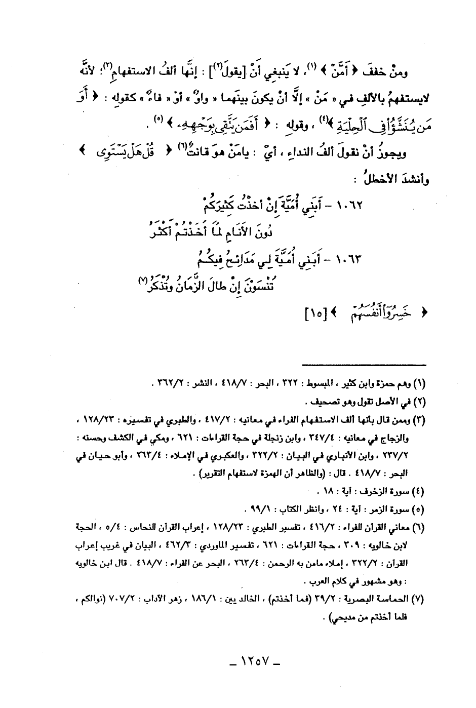 ومن خفف (أمن)، لا ينبغي أن [يقول]: إنها ألف الاستفهام، لأنه لا يستفهم بالألف في "من" إلا أن يكون بينهما "واو" أو "فاء" كقوله: (أو من ينشؤا في الحلية)، وقوله: (أفمن يتقي بوجهه).