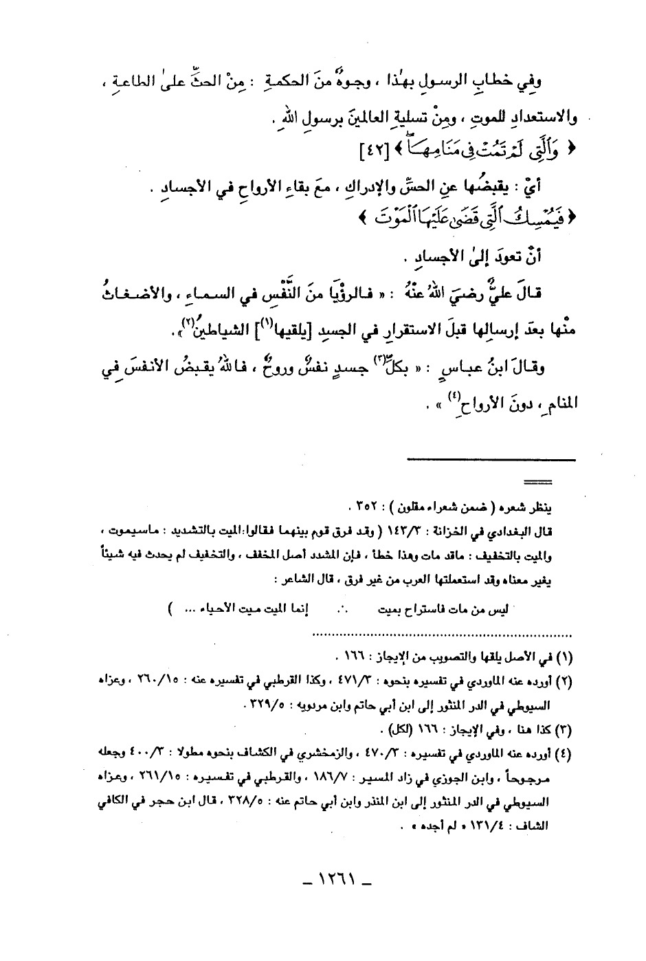 وفي خطاب الرسول بهذا، وجوه من الحكمة: من الحث على الطاعة والاستعداد للموت، ومن تسليم العالمين برسول الله. (والتي لم تمت في منامها)