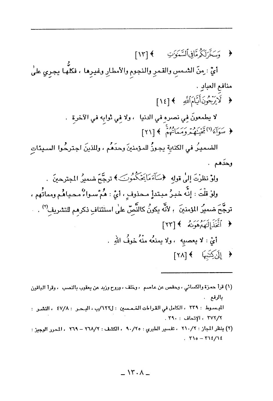 ولو نظرت إلى قوله (ساء ما يحكمون) ترجح ضمير المجترحين. ولو قلت: إنه خبر مبتدأ محذوف، أي: هم سواء محياهم ومماتهم، ترجح ضمير المؤمنين، لأنه يكون كالنص على استئناف ذكرهم للتشريف.
