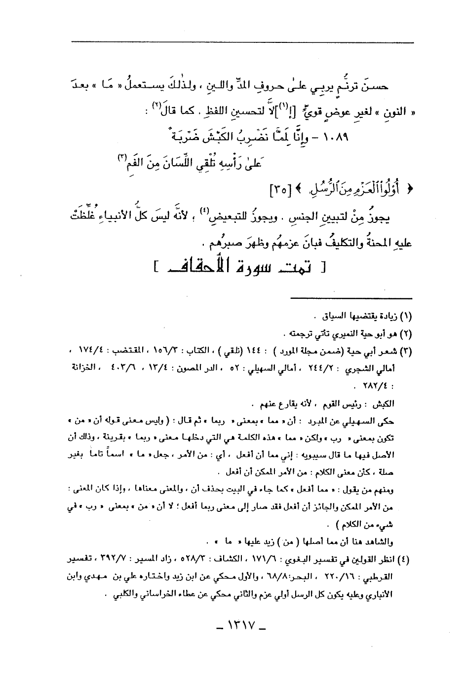 حسن ترنم يربي على حروف المد واللين، ولذلك يستعمل "ما" بعد "النون" لغير عوض قوي [إ] لا لتحسين اللفظ. كما قال: