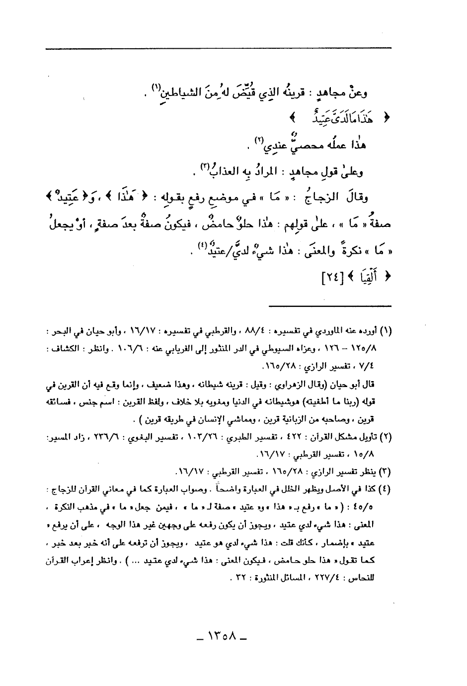 وقال الزجاج: "ما" في موضع رفع بقوله: (هذا)، و (عتيد) صفة "ما"، على قولهم: هذا حلو حامض، فيكون صفة بعد صفة، أو يجعل "ما" نكرة والمعنى: هذا شيء لدي عتيد.