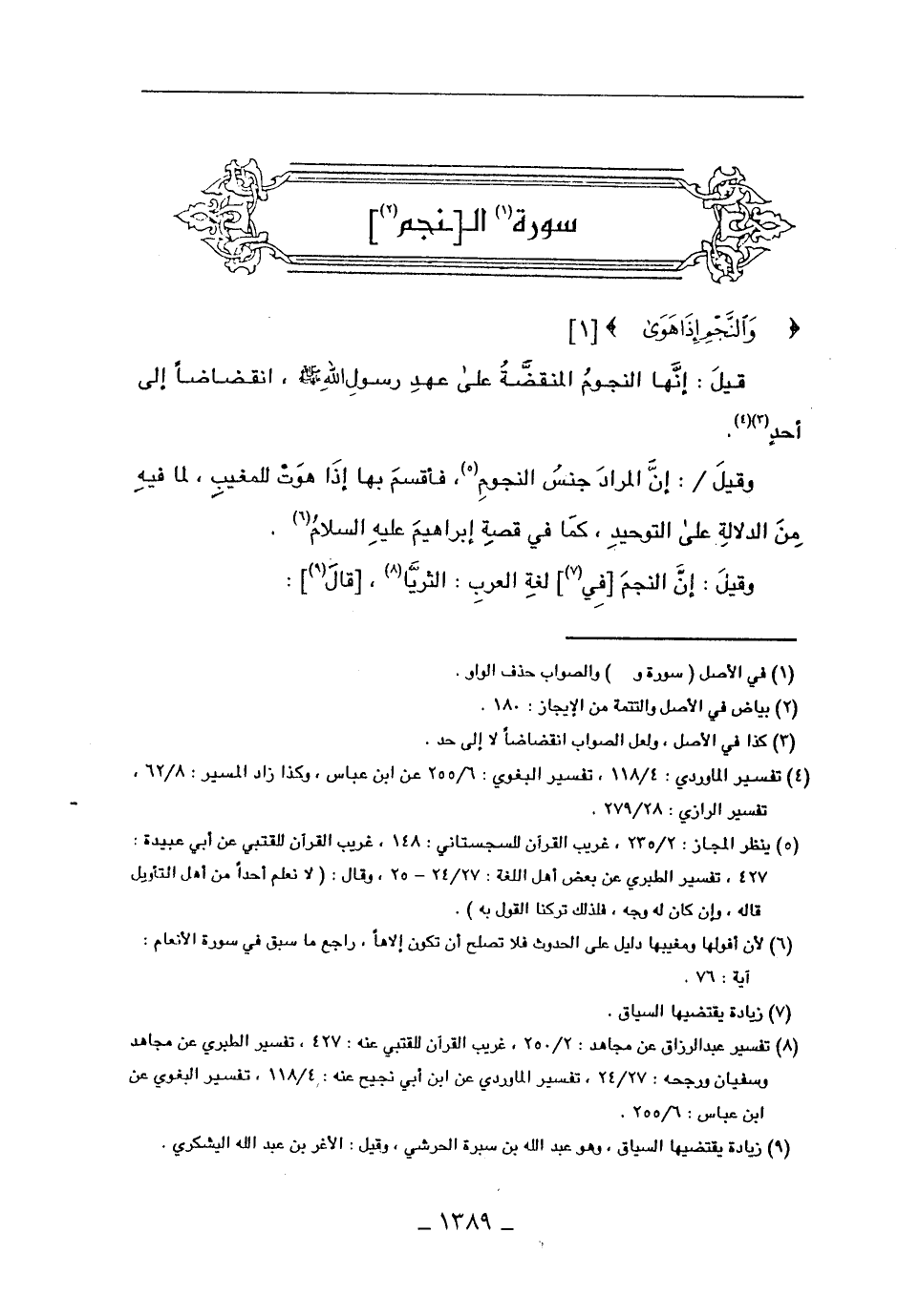 وقيل: إن المراد جنس النجوم، فأقسم بها إذا هوت للمغيب، لما فيه من الدلالة على التوحيد، كما في قصة إبراهيم عليه السلام. وقيل: إن النجم [في] لغة العرب: الثريا، [قال]: