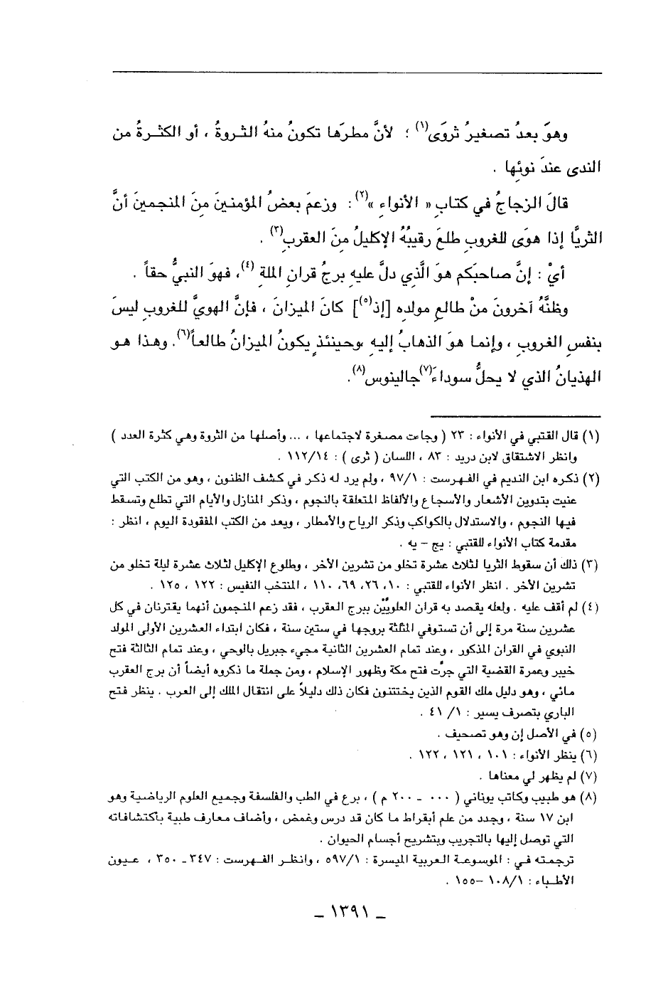 وظنه آخرون من طالع مولده [إذ] كان الميزان، فإن الهوي للغروب ليس بنفس الغروب، وإنما هو الذهاب إليه، وحينئذ يكون الميزان طالعاً، وهذا هو الهذيان الذي لا يحل سوداء جالينوس.