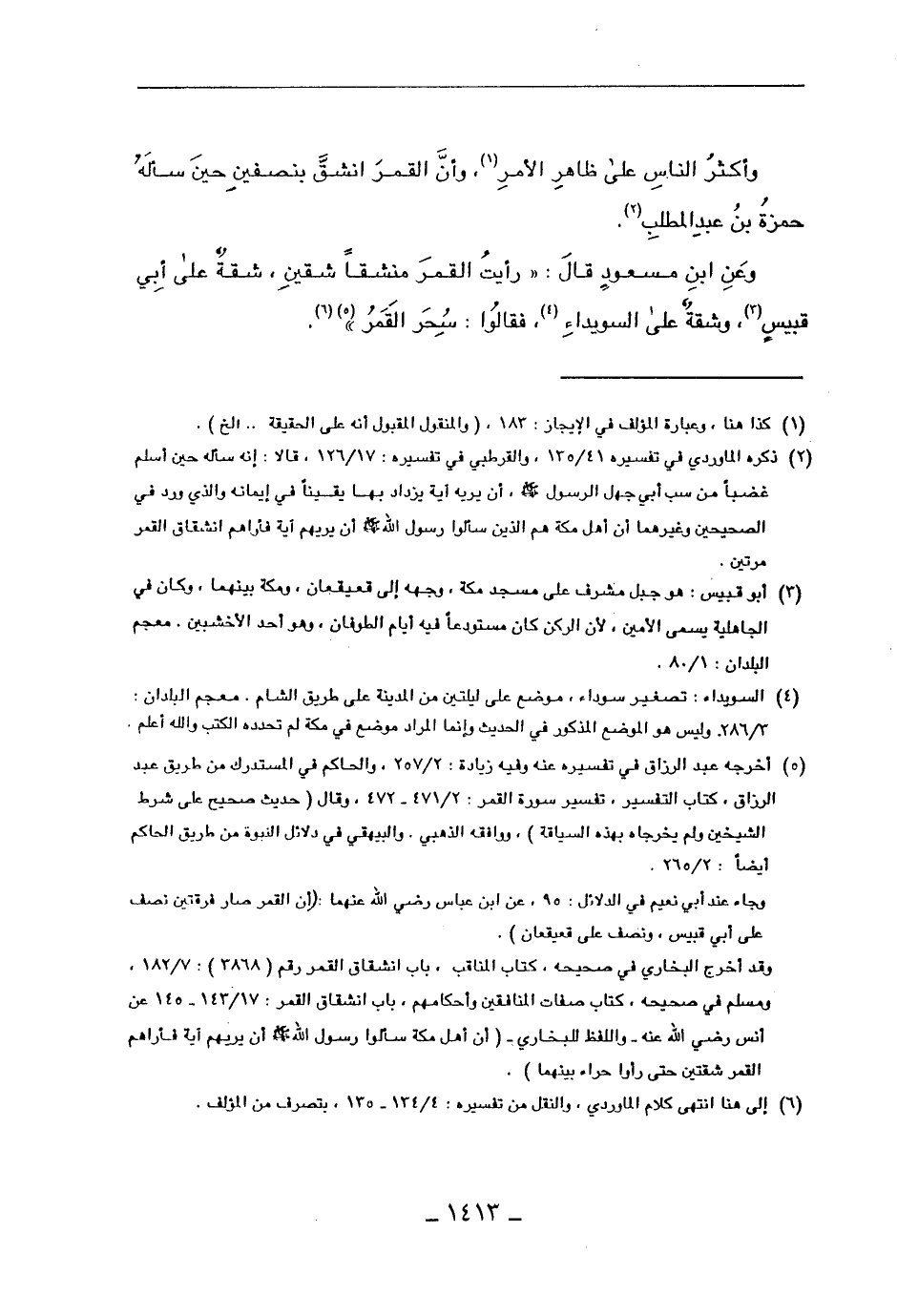 وعن ابن مسعود قال: "رأيت القمر منشقاً شقين، شقة على أبي قبيس، وشقى على السويداء، فقالوا: سحر القمر".
