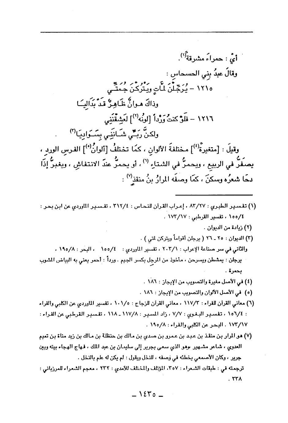 وقيل: [متغيرة] مختلفة الألوان، كما تختلف [ألوان] الفرس الورد، يصفر في الربيع، ويحمر في الشتاء، أو يحمر عند الانتفاش، ويغبر إذا دحا شعره وسكن، كما وصفه المرار بن منقذ: