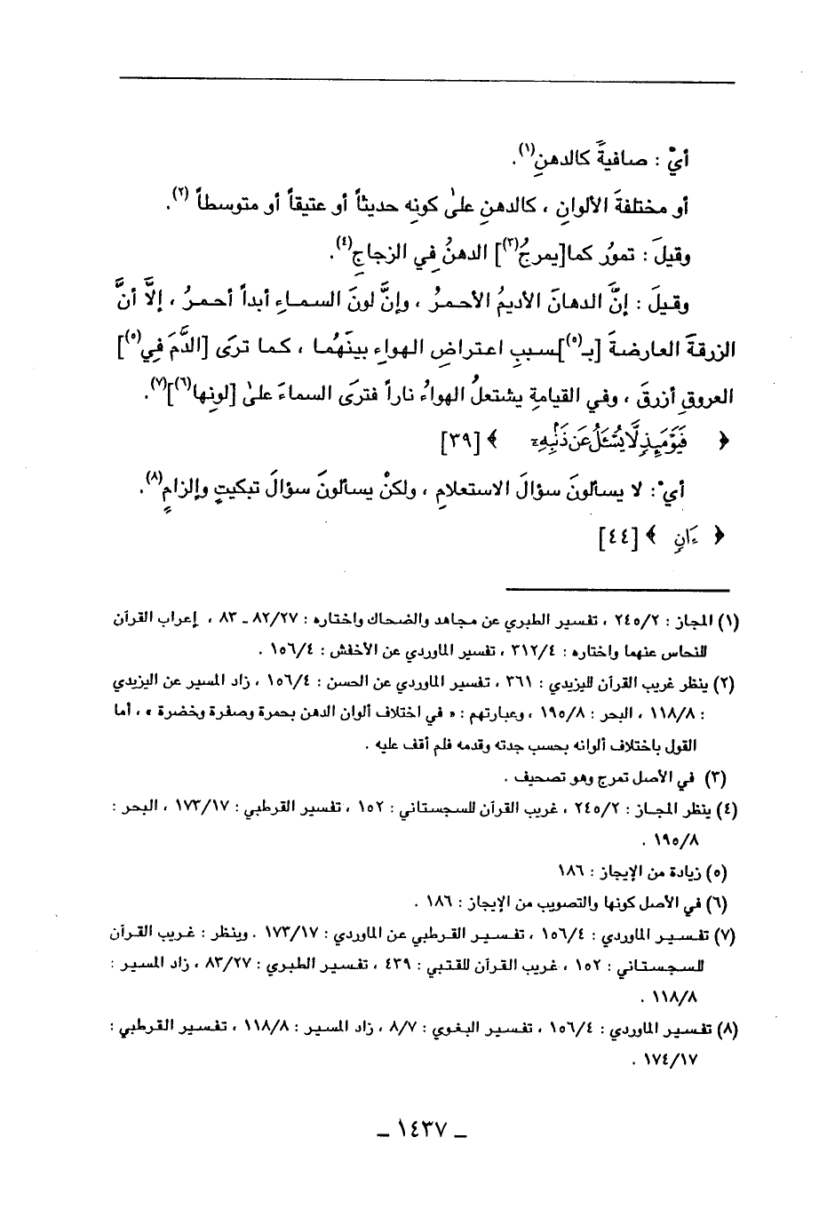 وقيل: إن الدهان الأديم الأحمر، وإن لون السماء أبداً أحمر، إلا أن الزرقة العارضة [بـ]ـسبب اعتراض الهواء بينهما، كما ترى [الدم في] العروق أزرق، وفي القيامة يشتعل الهواء ناراً فترى السماء على [لونها].