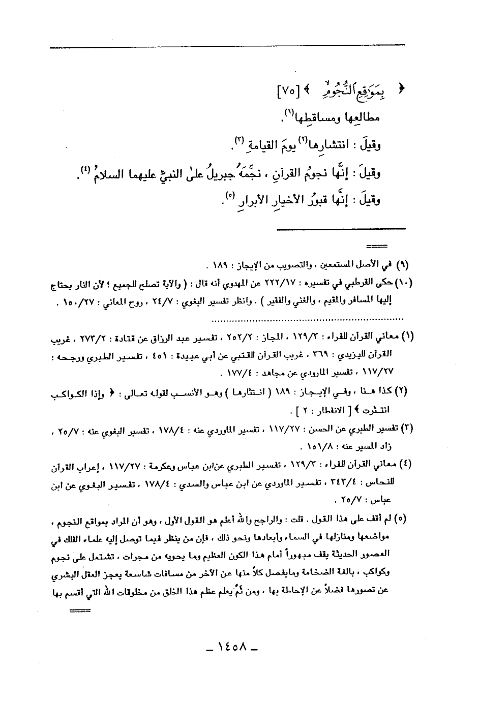 وقيل: إنها نجوم القرآن، نجمه جبريل على النبي عليهما السلام. وقيل: إنها قبور الأخيار الأبرار.