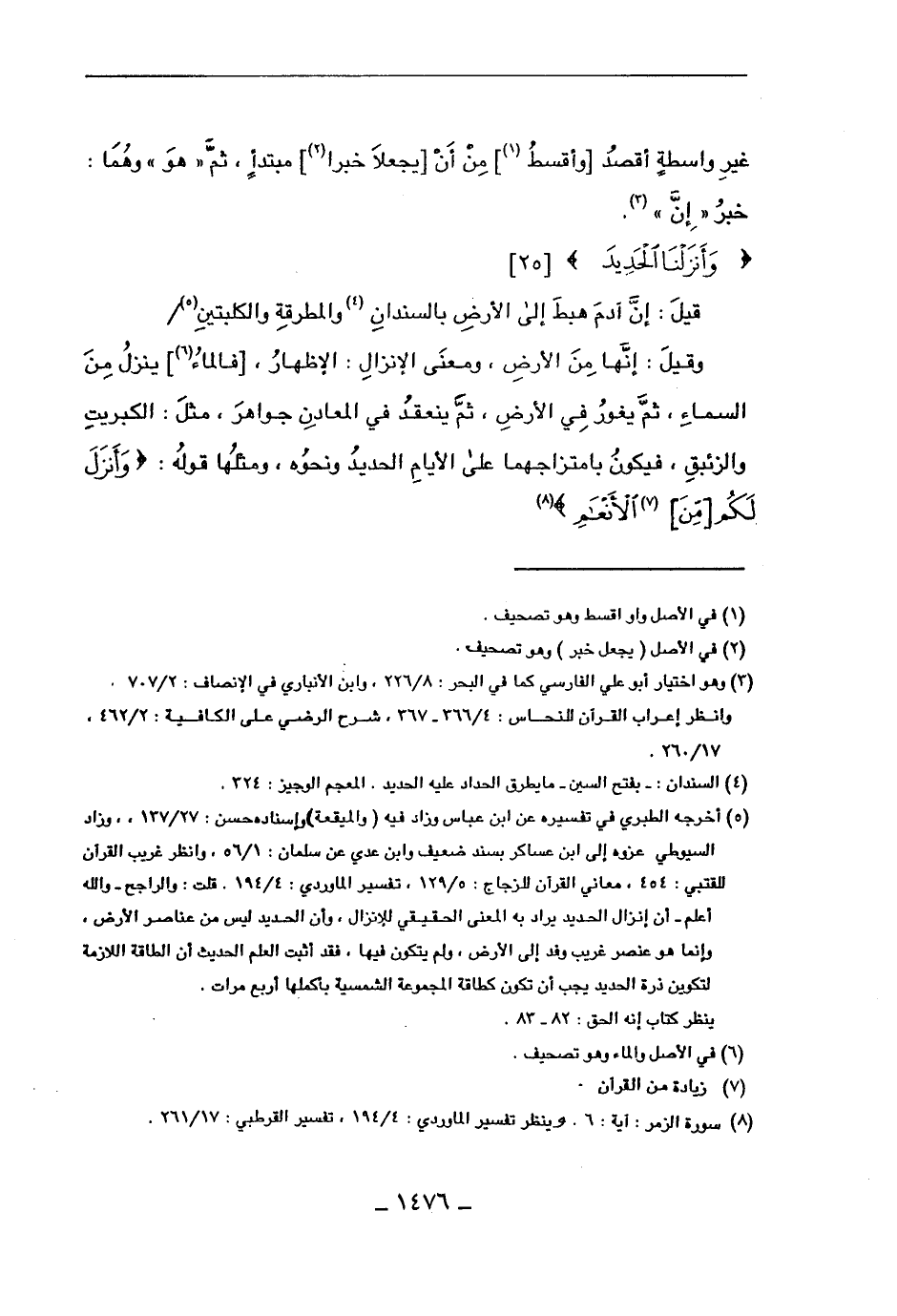 قيل: إن آدم هبط إلى الأرض بالسندان والمطرقة والكلبتين. وقيل: إنها من الأرض، ومعنى الإنزال: الإظهار، [فالماء] ينزل من السماء، ثم يغور في الأرض، ثم ينعقد في المعادن جواهر، مثل: الكبريت والزئبق، فيكون بامتزاجهما على الأيام الحديد ونحوه، ومثلها قوله: (وأنزل لكم [من] الأنعام).
