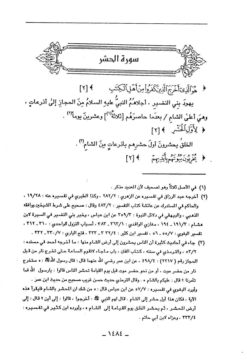 يهود بني النضير، أجلاهم النبي عليه السلام من الحجاز إلى أذرعات، وهي أعلى الشام بعدما حاصرهم [ثلاثة] وعشرين يوماً.