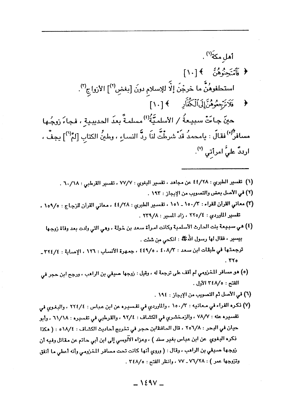 حين جاءت سبيعة الأسلمية مسلمة بعد الحديبية، فجاء زوجها مسافر فقال: يا محمد قد شرطت لنا رد النساء، وطين الكتاب [لم] يجف، اردد علي امرأتي.