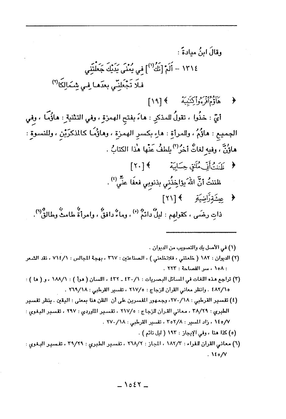 أي: خذوا، تقول للمذكر: هاء بفتح الهمزة، وفي التثنية: هاؤما، وفي الجميع: هاؤم، وللمرأة: هاء بكسر الهمزة، وهاؤما كالمذكرين، وللنسوة: هاؤن، وفيه لغات أخر يلطف عنها هذا الكتاب.