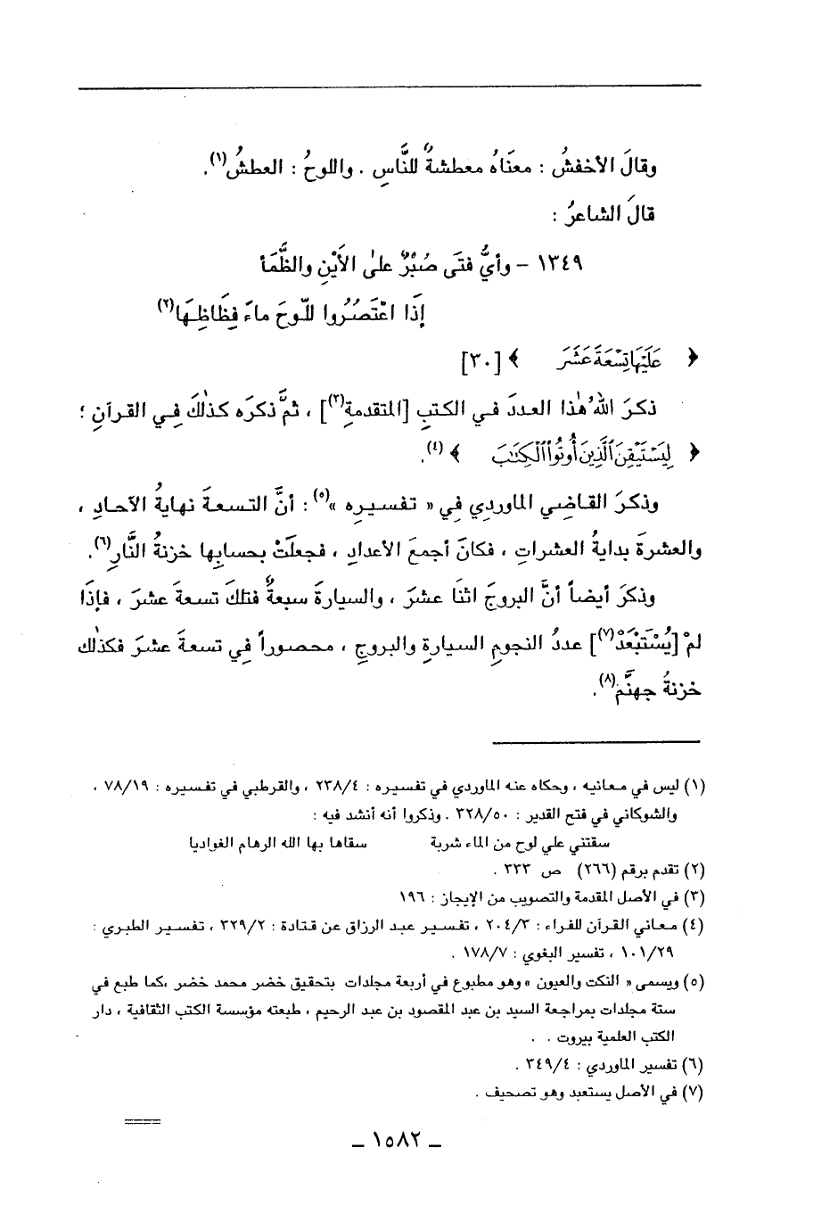 وذكر أيضاً أن البروج اثنا عشر، والسيارة سبعة فتلك تسعة عشر، فإذا لم [يستبعد] عدد النجوم السيارة والبروج، محصوراً في تسعة عشر فكذلك خزنة جهنم.