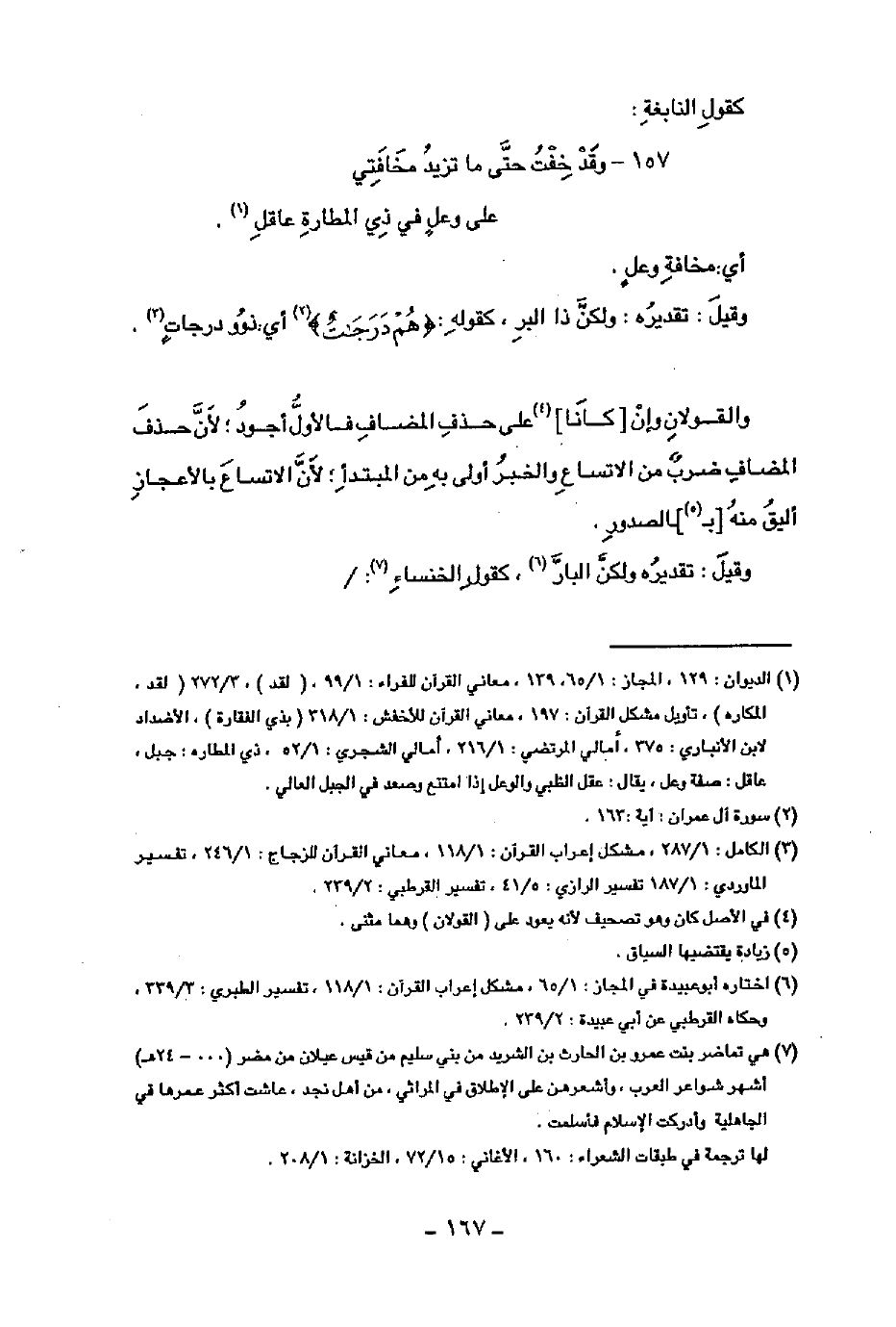 157 - وقد خفت حتى ما تزيد مخافتي ... على وعل ذي المطارة عاقل