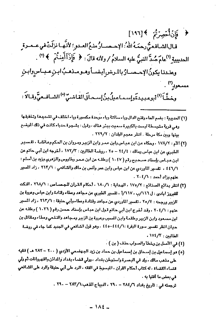 قال الشافعي رحمه الله: الإحصار منع العدو؛ لأنها نزلت في عمرة الحديبية عام صد النبي عليه السلام ولأنه قال: (فإذا أمنتم). وعندنا يكون الإحصار بالمرض أيضا وهو مذهب ابن عباس وابن مسعود.
