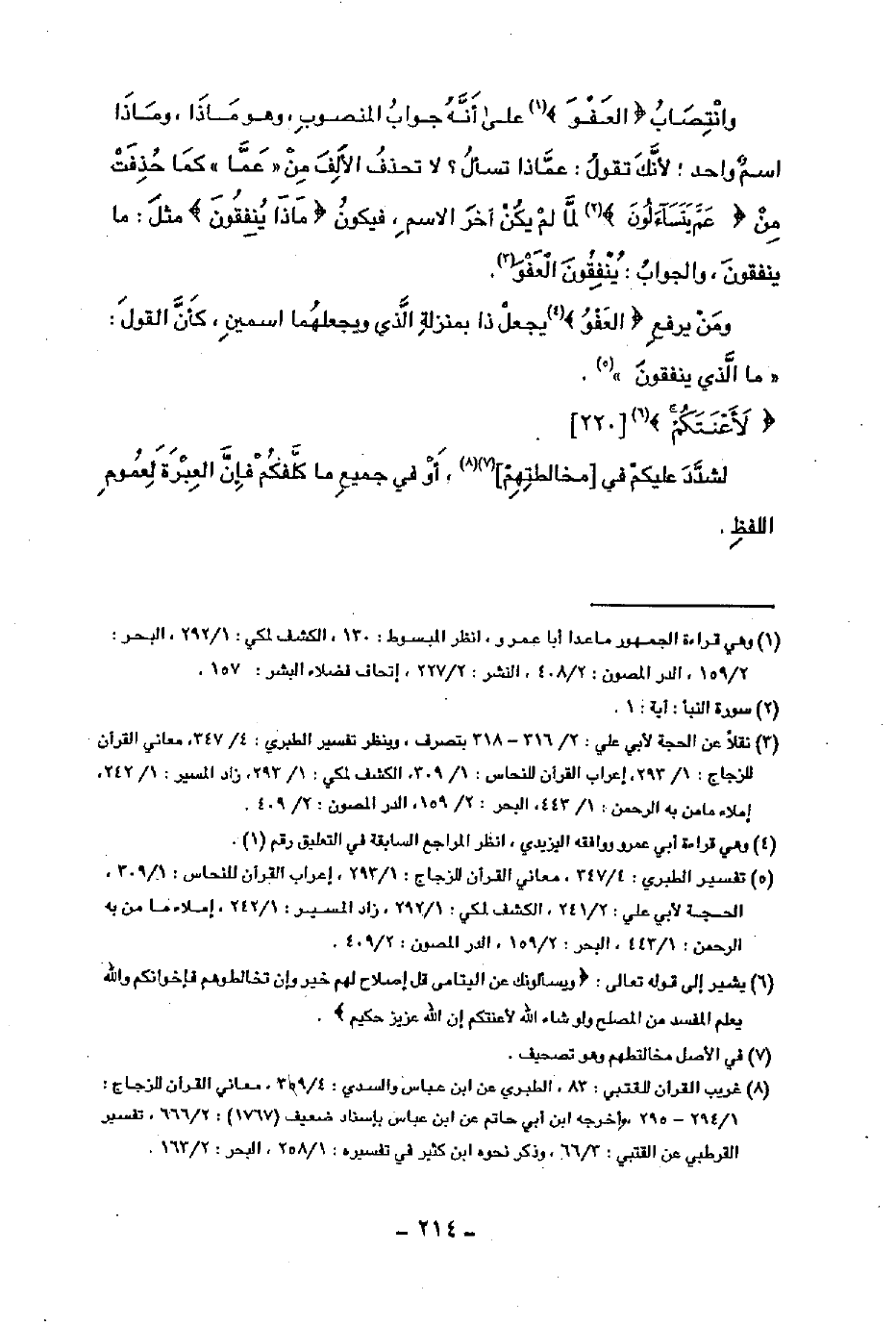 وانتصاب (العفو) على أنه جواب المنصوب، وهو ماذا، وماذا اسم واحد؛ لأنك تقول: عماذا تسأل؟ لا تحذف الألف من "عما" كما حذفت من (عم يتساءلون) لما لم يكن آخر الاسم، فيكون (ماذا ينفقون) مثل: ما ينفقون، والجواب: ينفقون العفو. ومن يرفع (العفو) يجل ذا بمنزلة الذي ويجعلها اسمين، كأن القول: "ما الذي ينفقون".