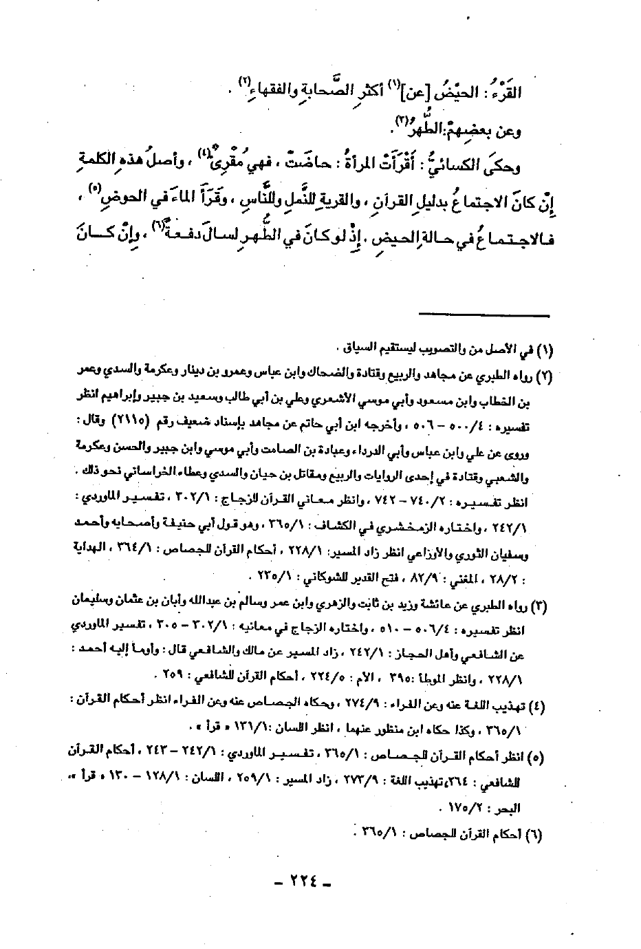 وحكى الكسائي: أقرأت المرأة: حاضت، فهي مقرى، وأصل الكلمة إن كان الاجتماع بدليل القرآن، والقرية للنمل وللناس، وقرأ الماء في الحوض، فالاجتماع في حالة الحيض. إذ لو كان في الطهر لسال دفعة، وإن كان