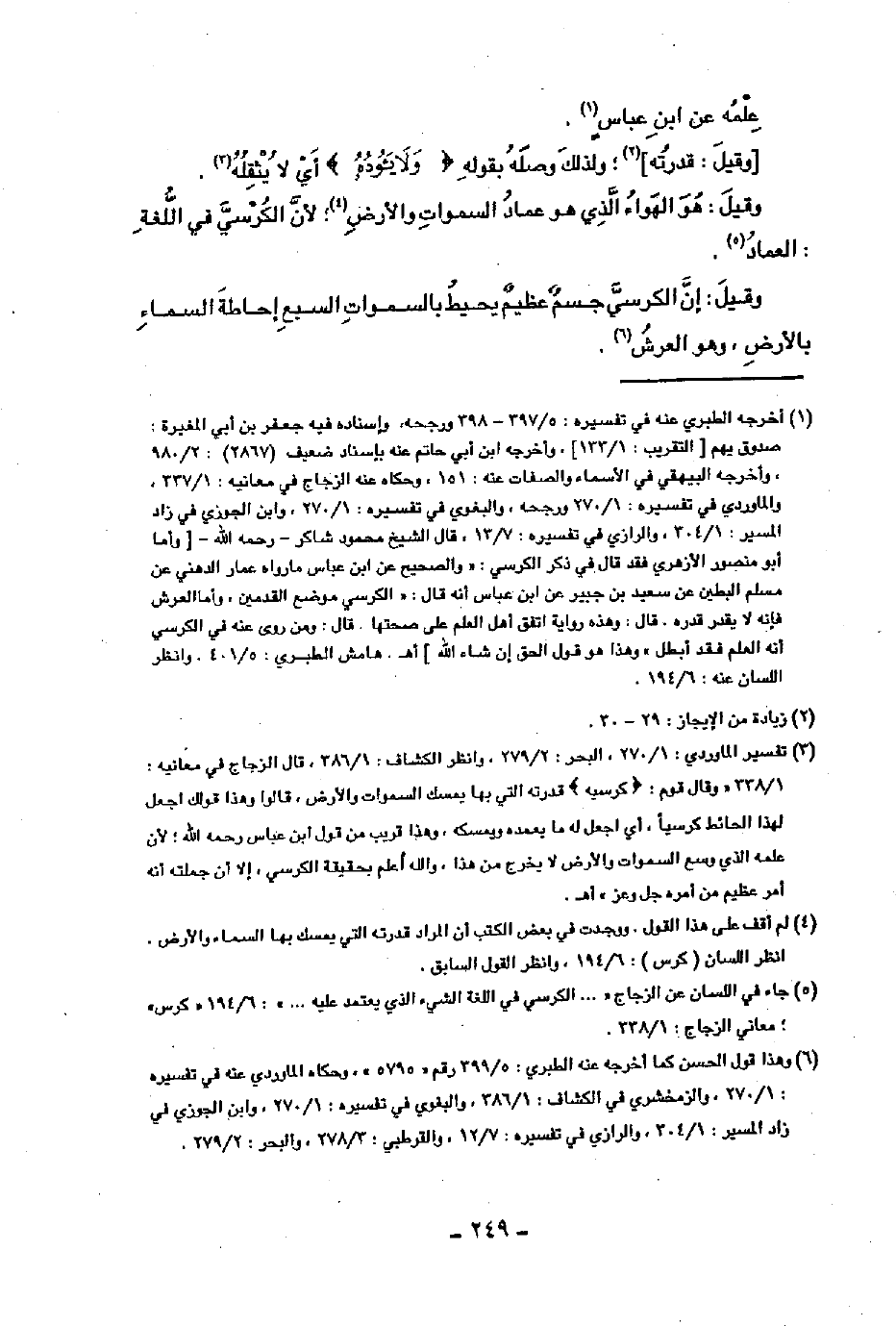 [وقيل: قدرته]؛ ولذلك وصله بقوله (ولا يؤده) أي لا يثقله. وقيل: هو الهواء الذي هو عماد السموات والأرض؛ لأن الكرسي في اللغة: العماد.