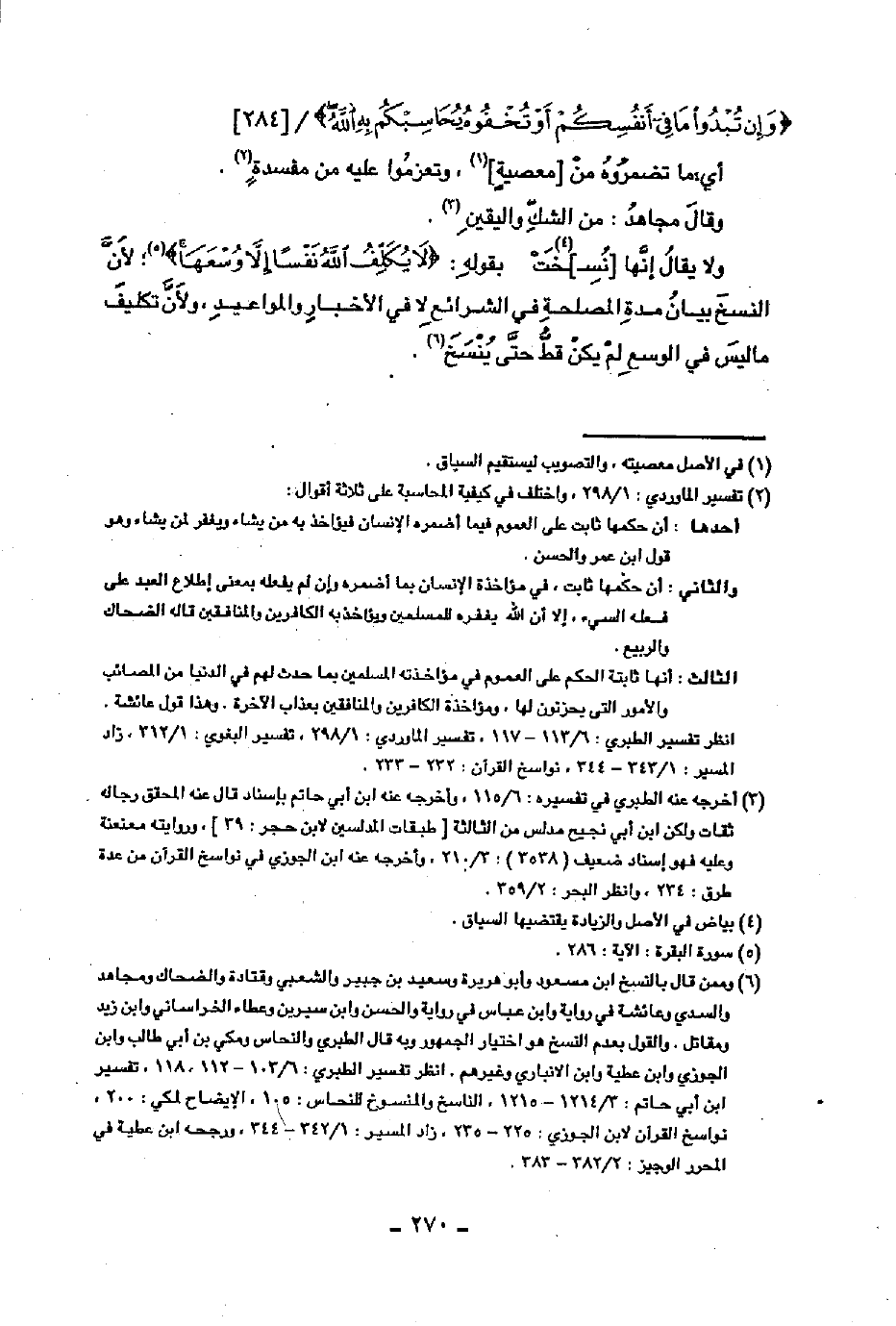 ولا يقال إنها [نُسِـ]ـخت بقوله: (لا يكلف الله نفسا إلا وسعها)؛ لأن النسخ بيان مدة المصلحة في الشرائع لا في الأخبار والمواعيد، ولأن تكليف ما ليس في الوسع لم يكن قط حتى ينسخ.