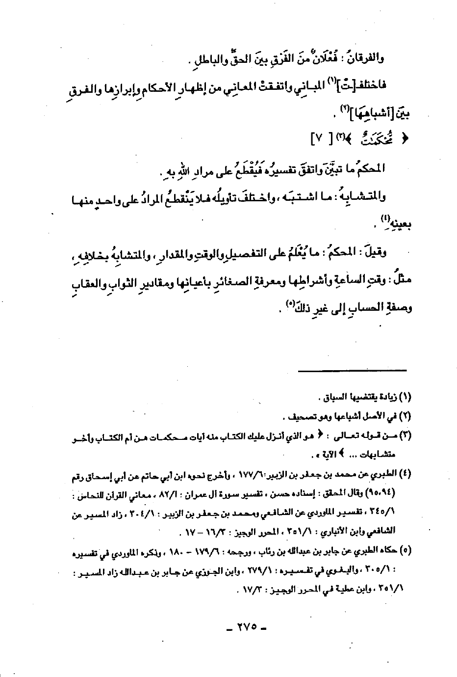 وقيل: المحكم: ما يعلم على التفصيل والوقت والمقدار، والمتشابه بخلافه، مثل: وقت الساعة وأشراطها ومعرفة الصغائر بأعيانها ومقادير الثواب والعقاب وصفة الحساب إلى غير ذلك.