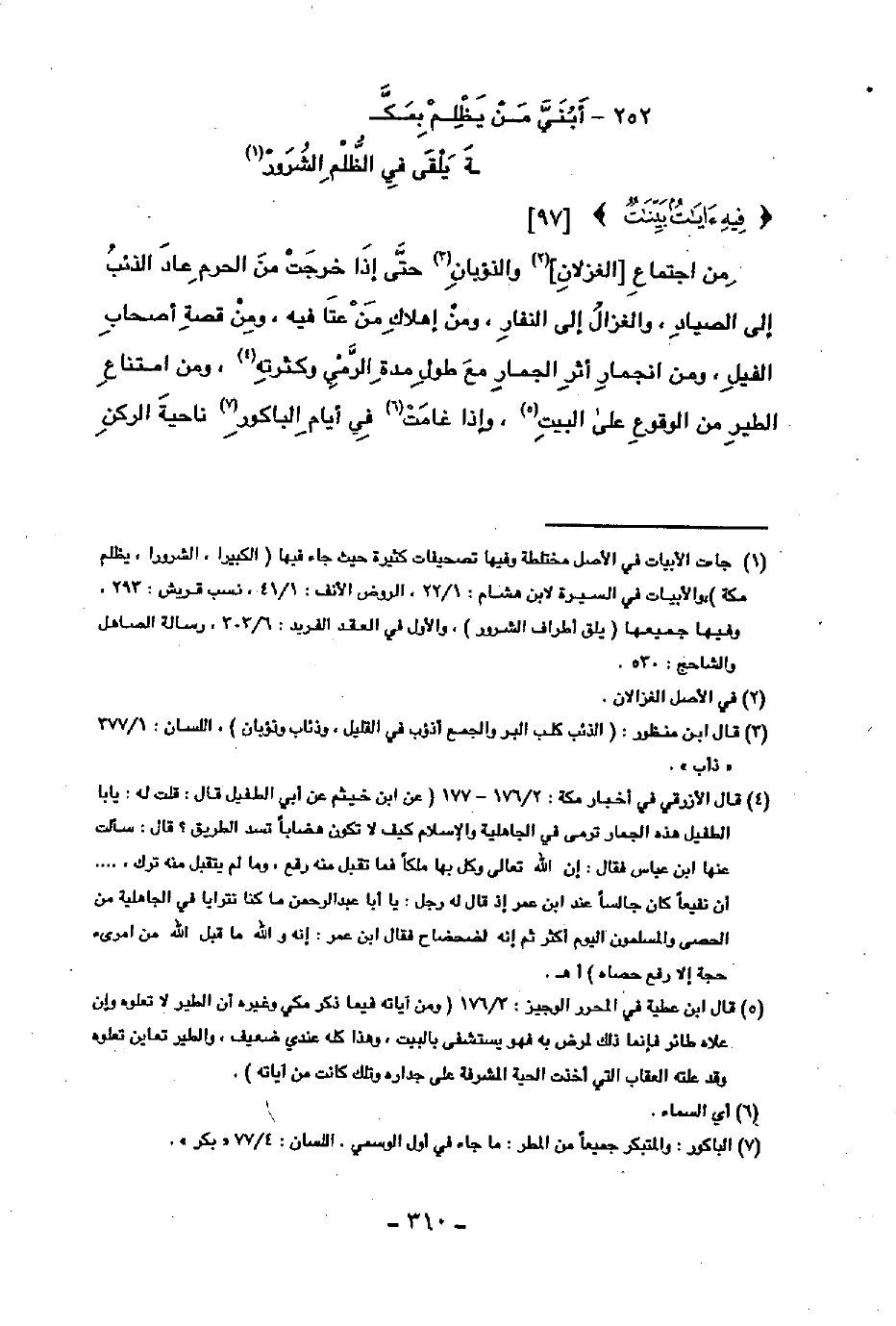 من اجتماع [الغزلان] والذؤبان حتى إذا خرجت من الحرم عاد الذئب إلى الصياد، والغزال إلى النفار، ومن إهلاك من عتا فيه، ومن قصة أصحاب الفيل، ومن انجمار أثر الجمار مع طول مدة الرمي وكثرته، ومن امتناع الطير من الوقوع على البيت، وإذا غامت في أيام الباكور ناحية الركن