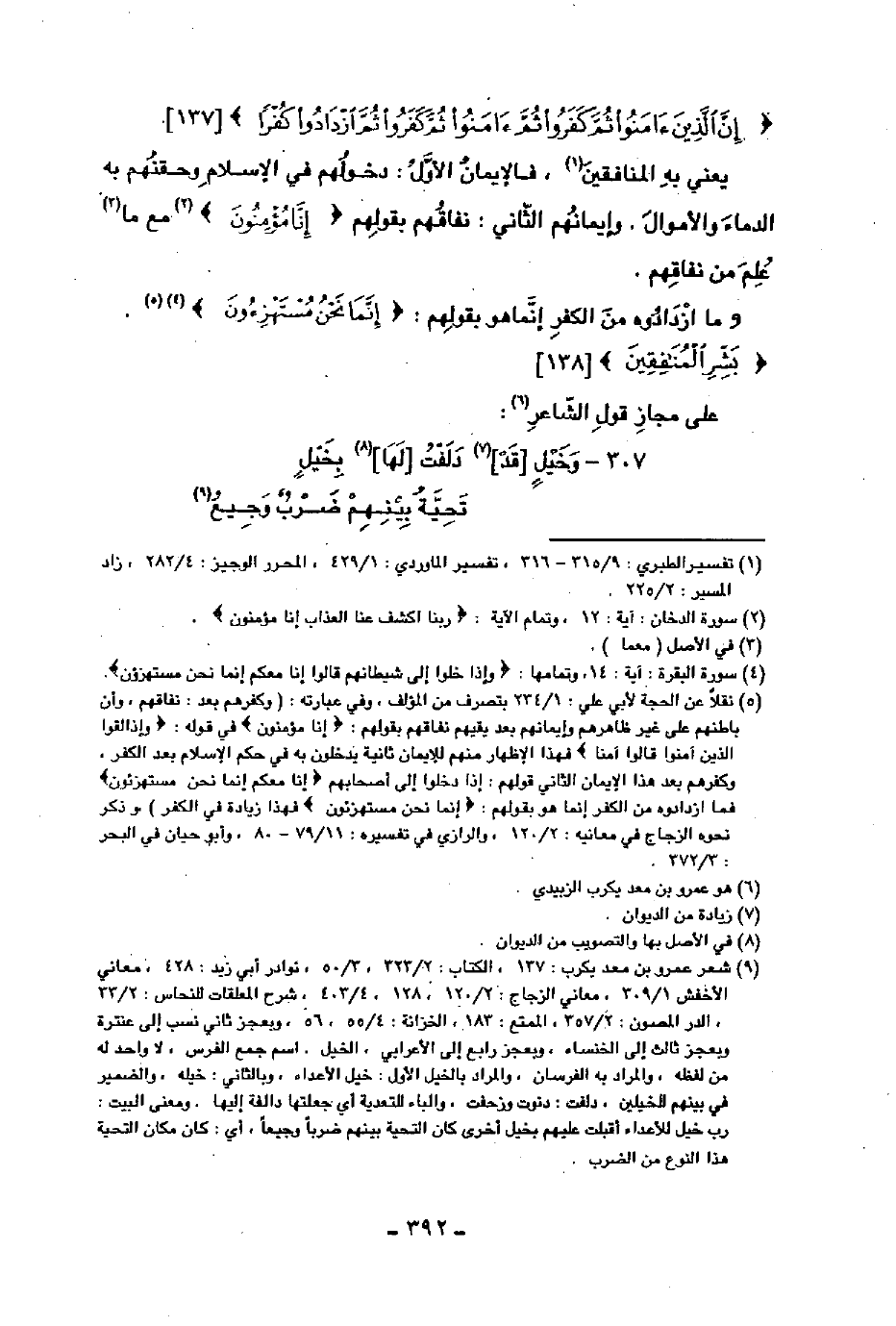 (إن الذين ءامنوا ثم كفروا ثم ءامنوا ثم كفروا ثم ازدادوا كفرا) يعني به المنافقين، فالإيمان الأول: دخولهم في الإسلام وحقنهم به الدماء والأموال. وإيمانهم الثاني: نفاقهم بقولهم (إنا مؤمنون) مع ما عُلِمَ من نفاقهم.